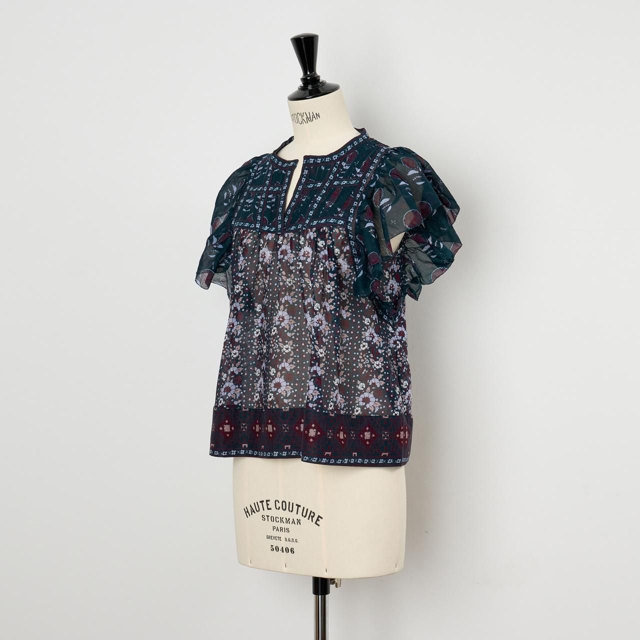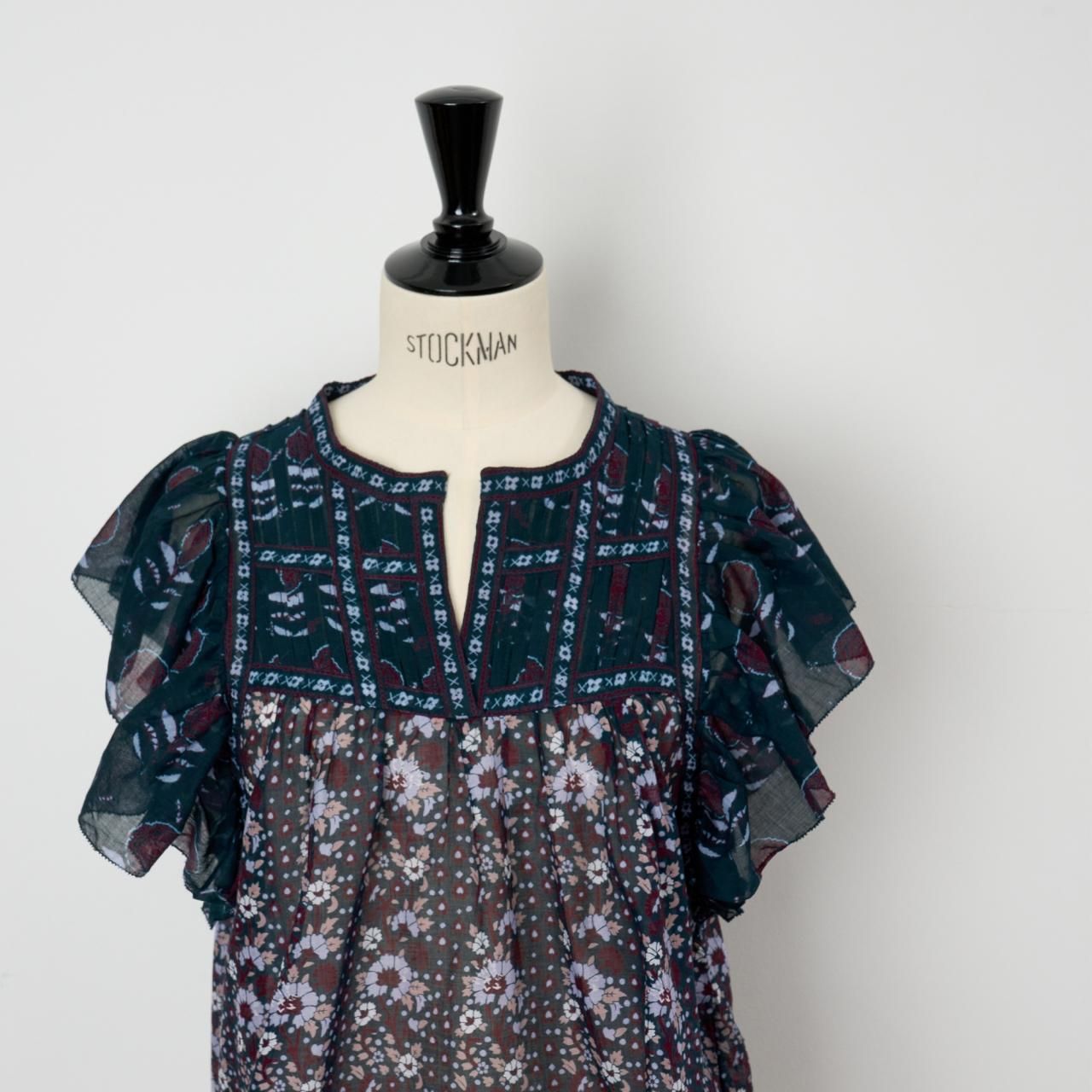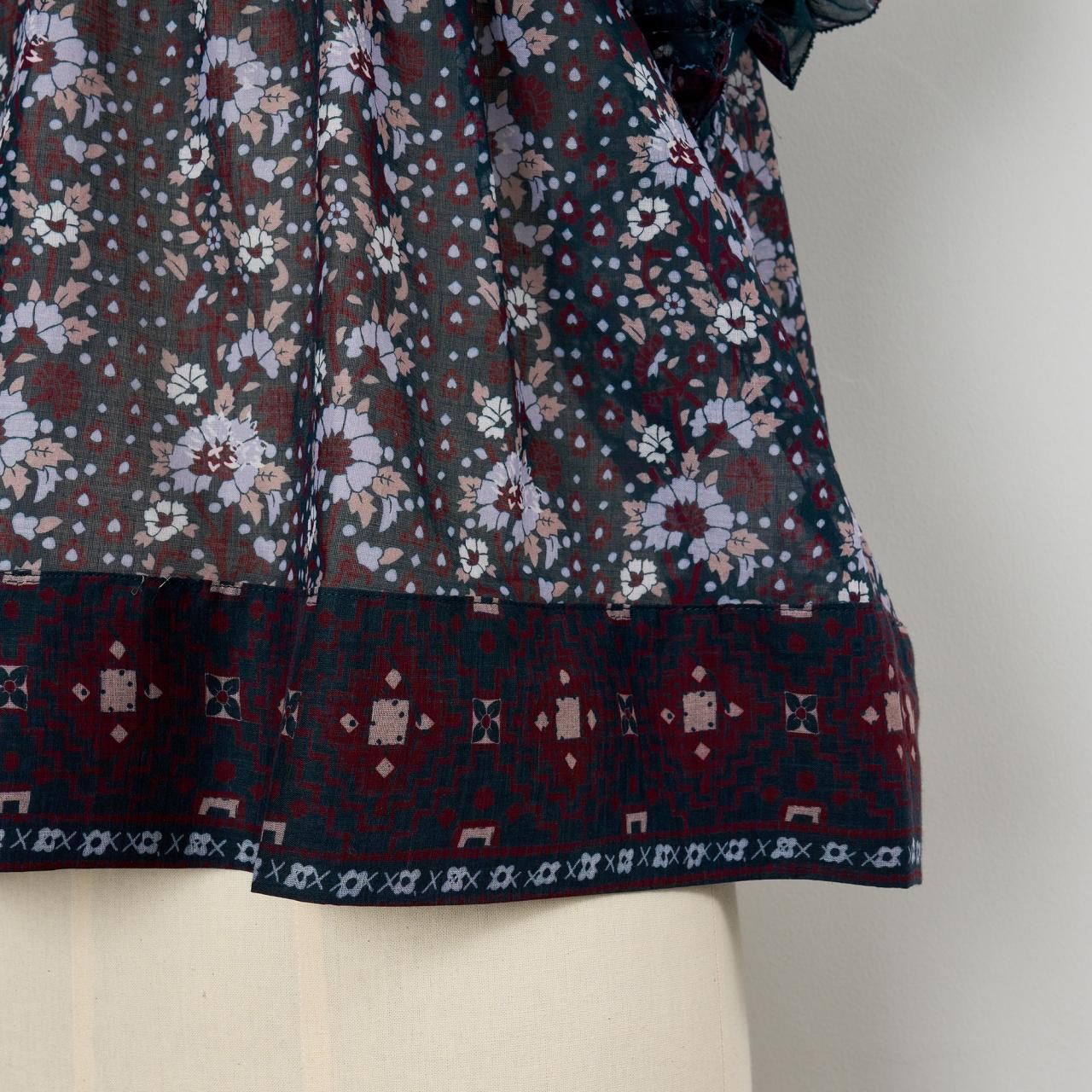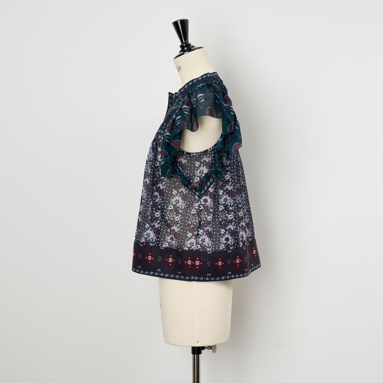 インド綿を使用したフラワープリントのフレアスリーブブラウス。