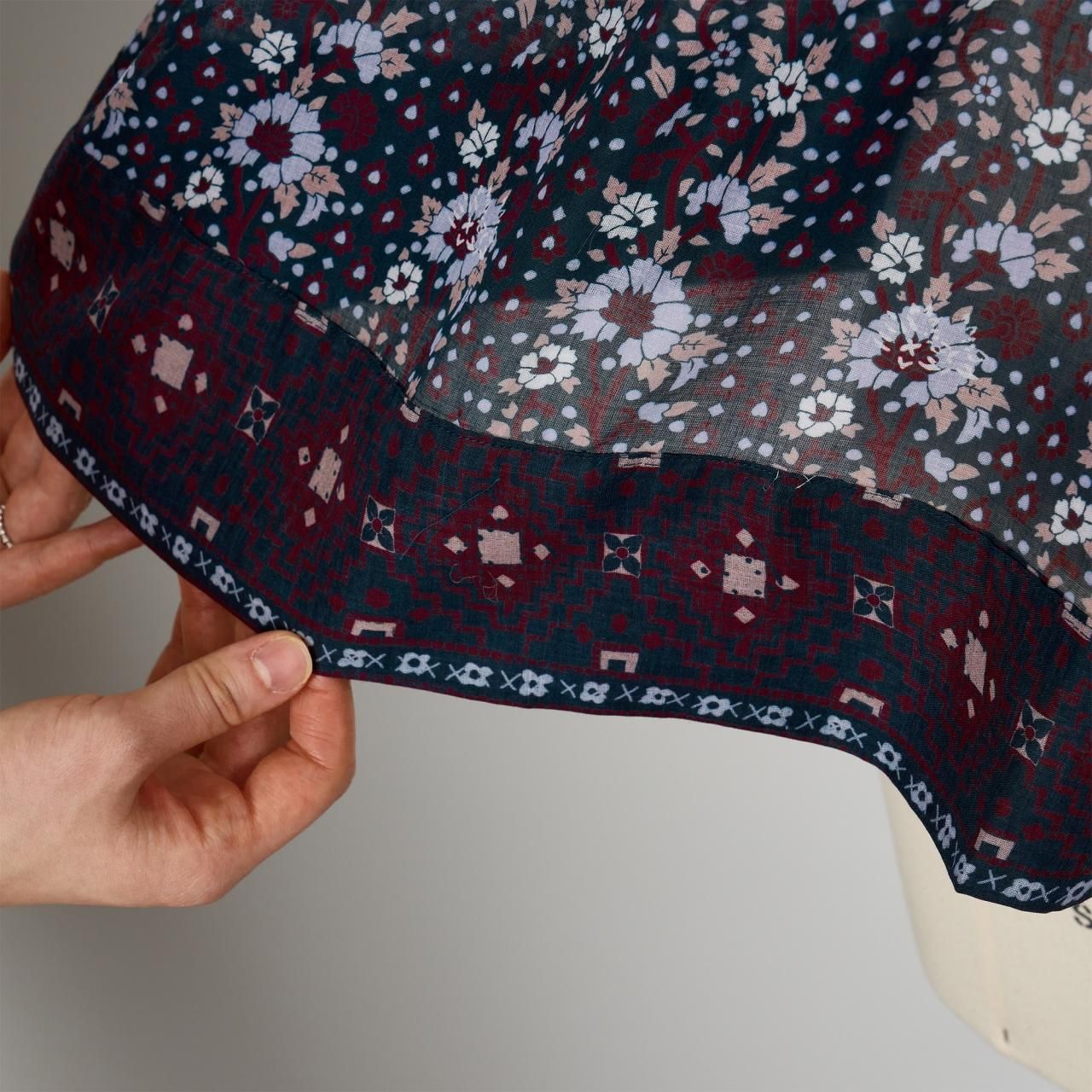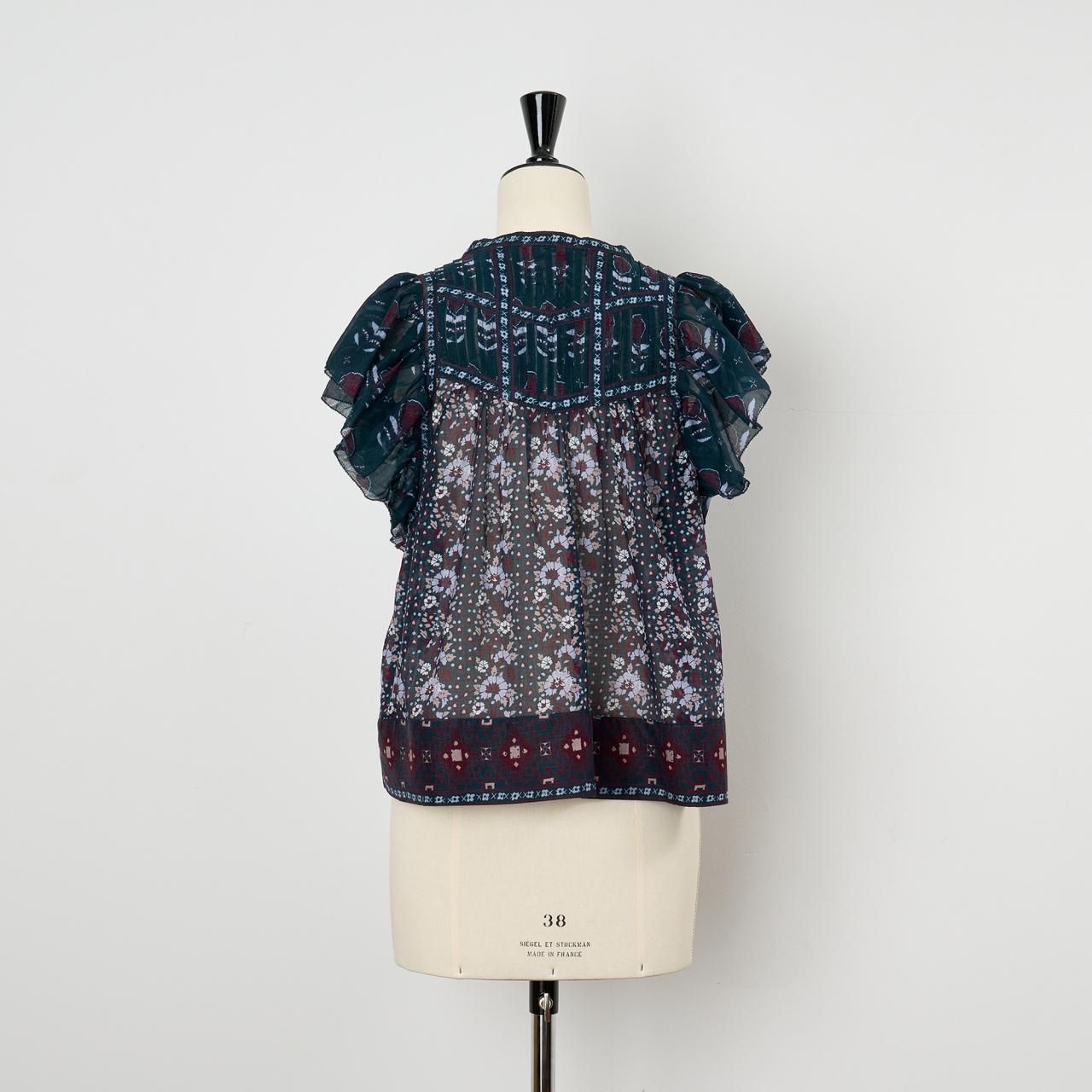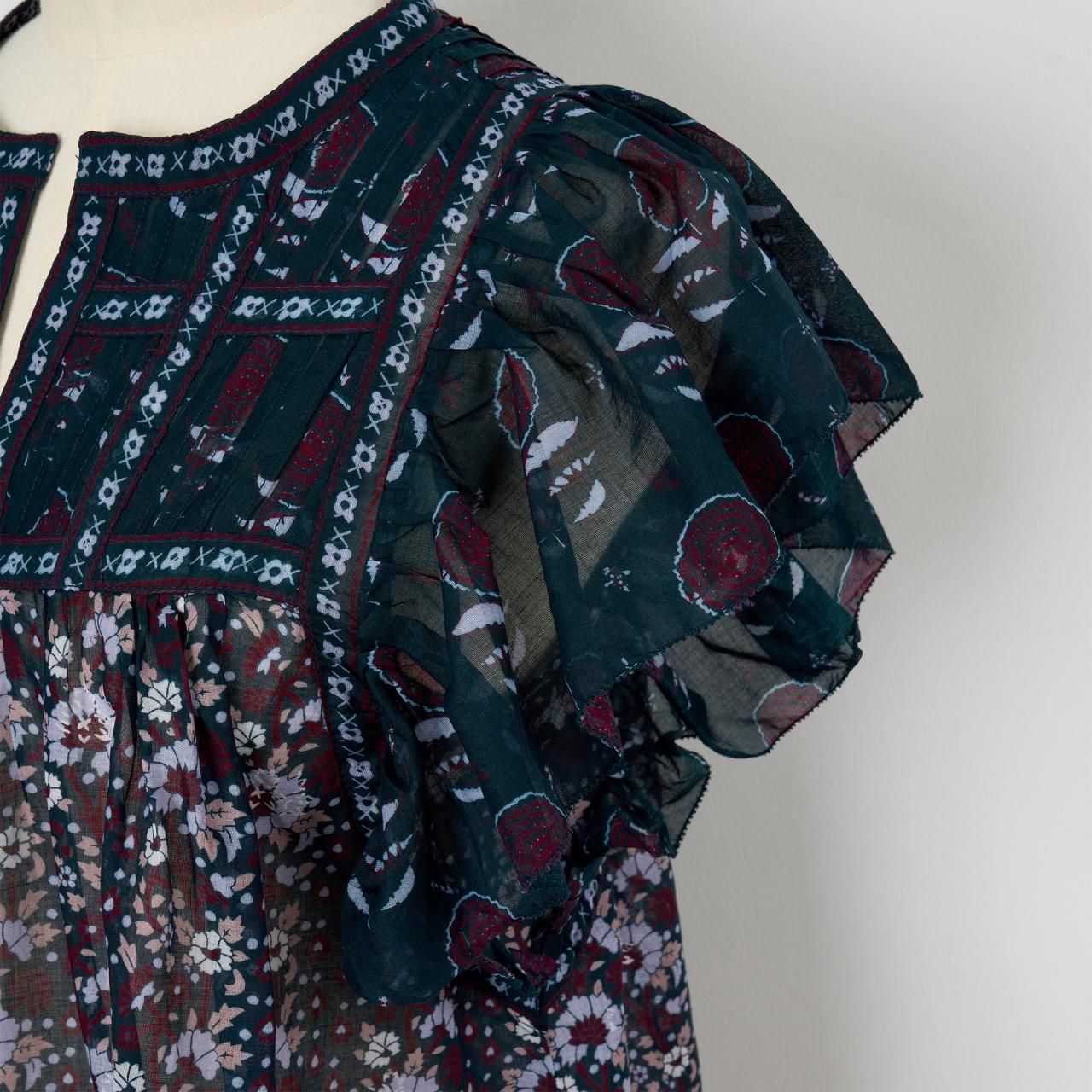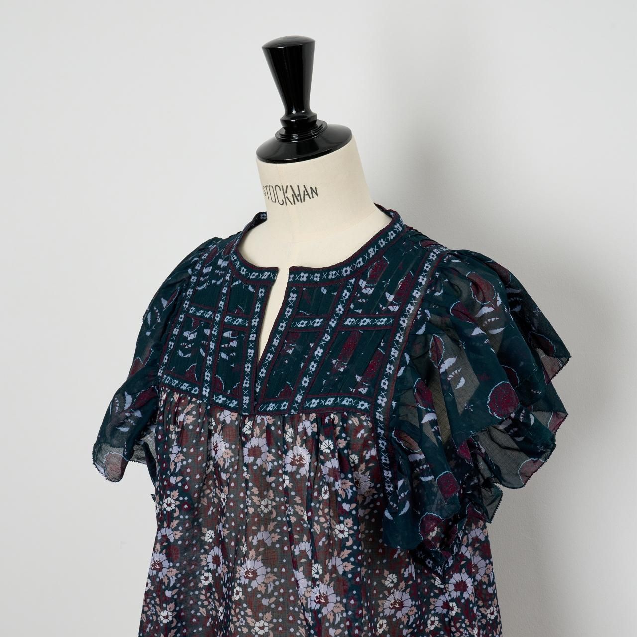 インド綿を使用したフラワープリントのフレアスリーブブラウス。