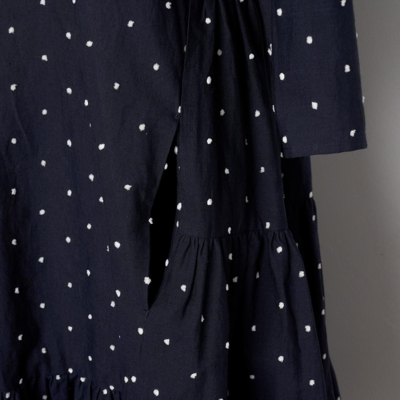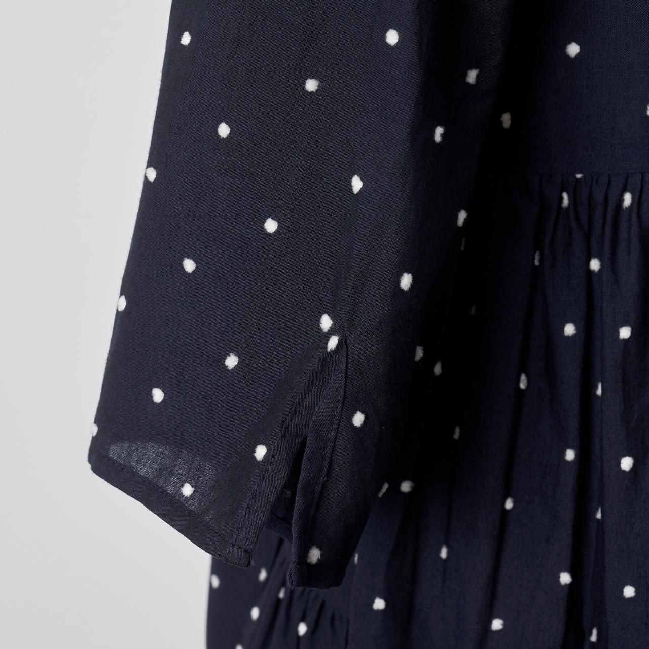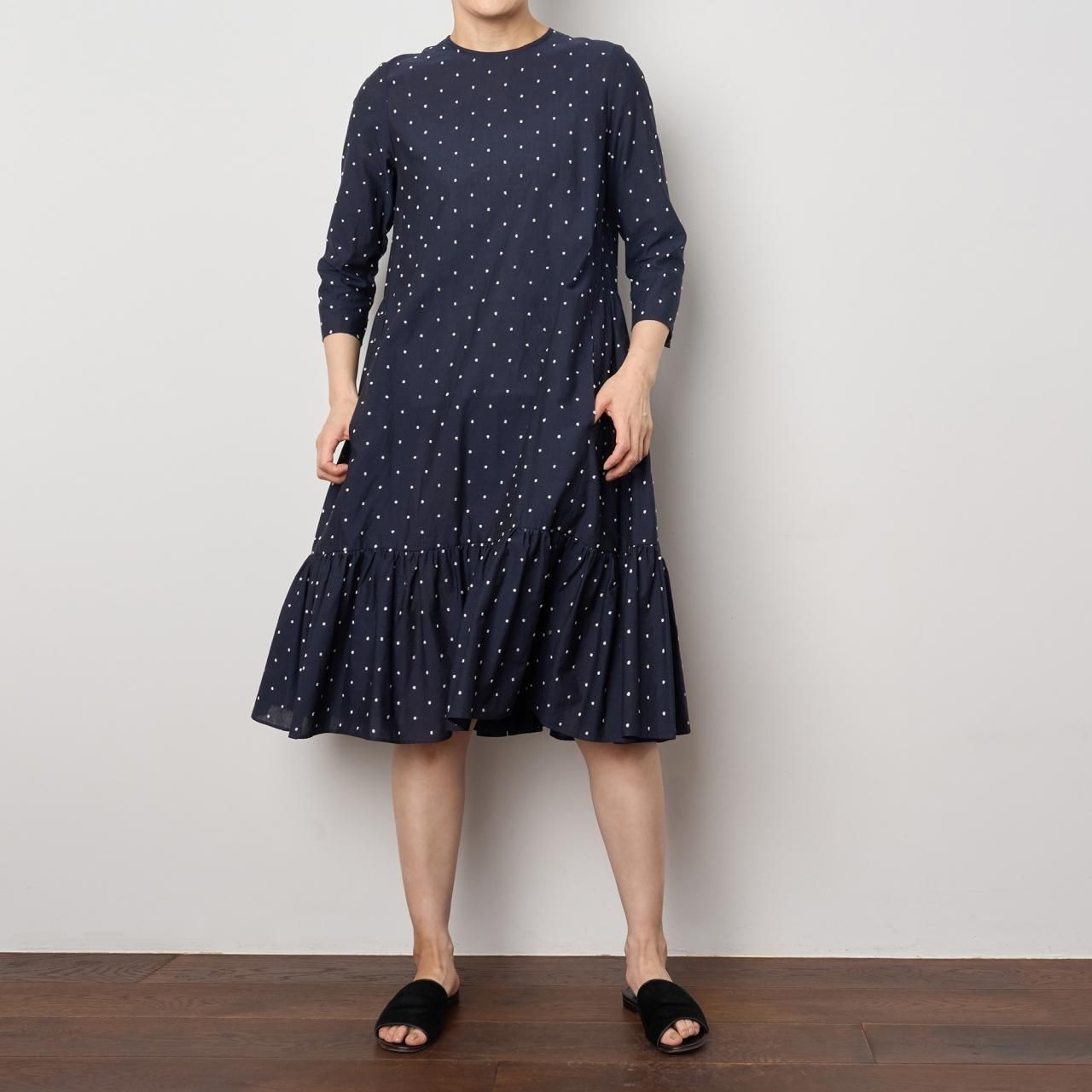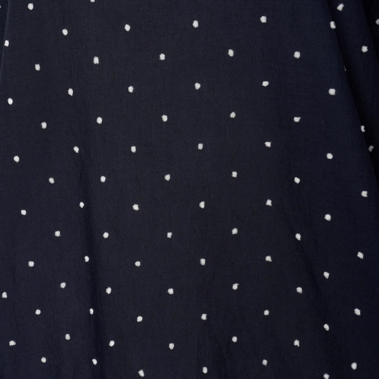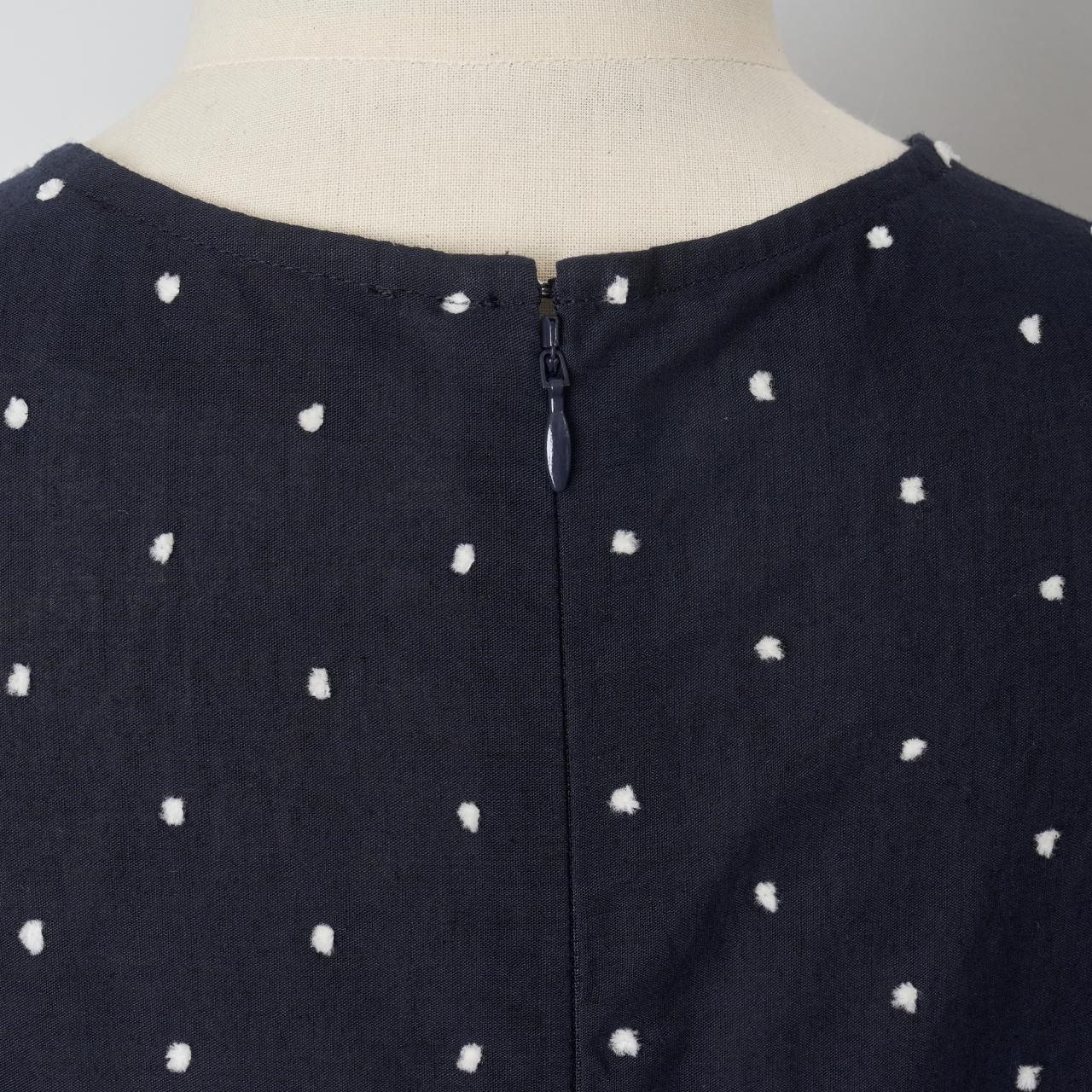 小さなドット模様が凹凸に織り込まれた、綿麻素材の生地のワンピースです。
