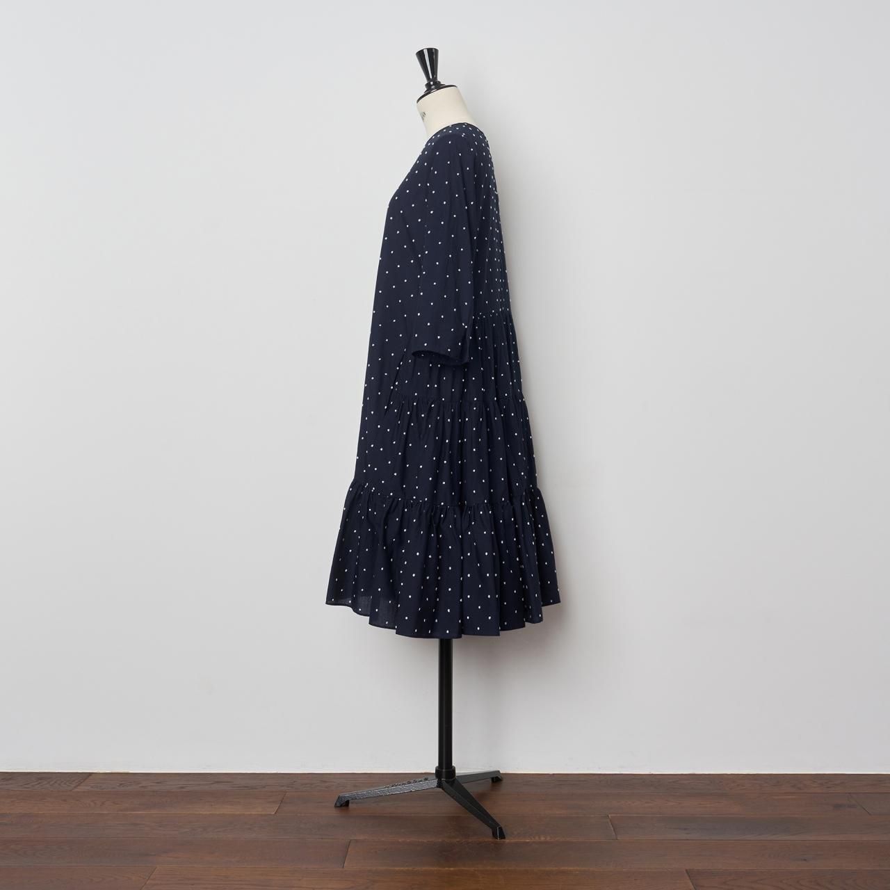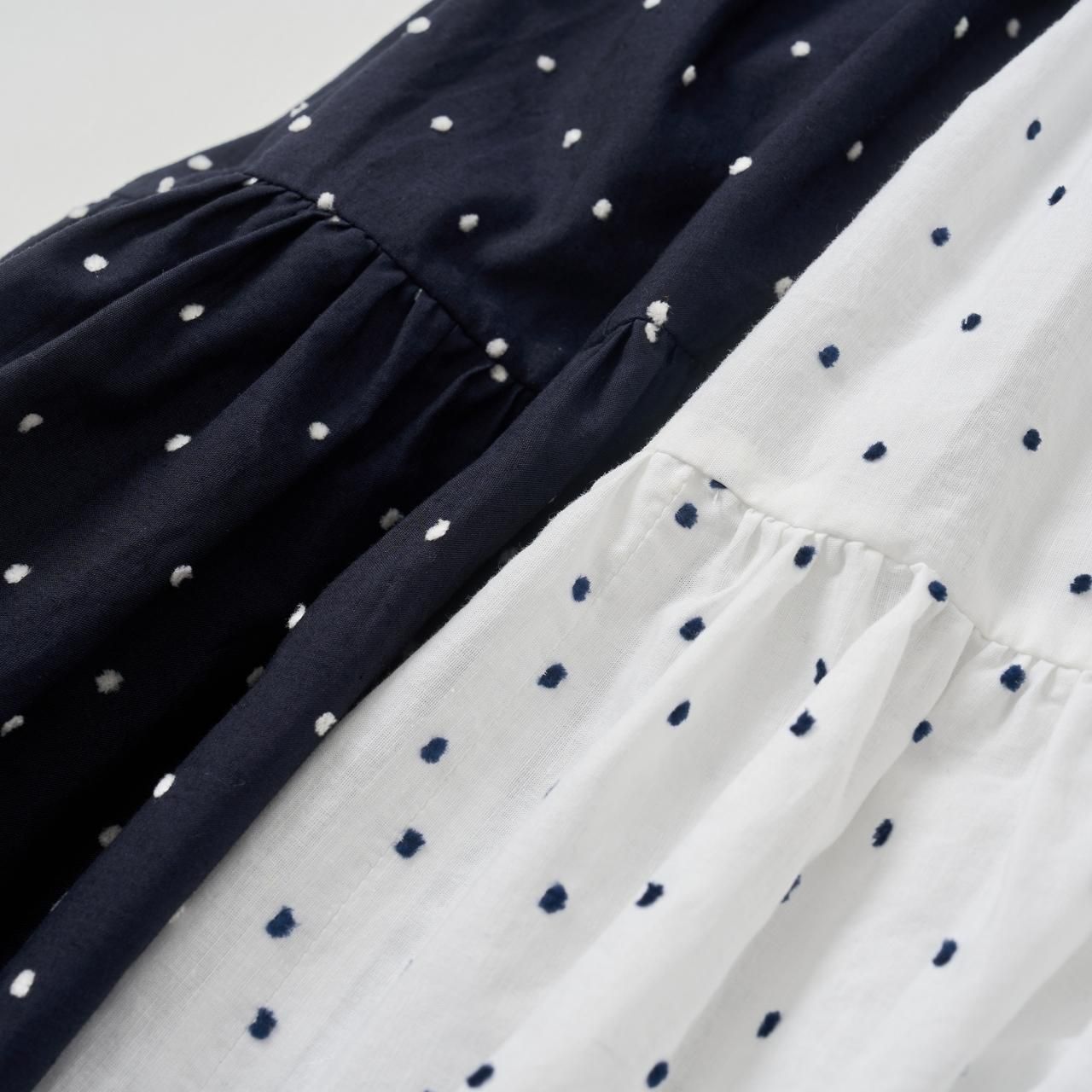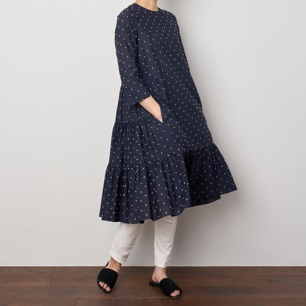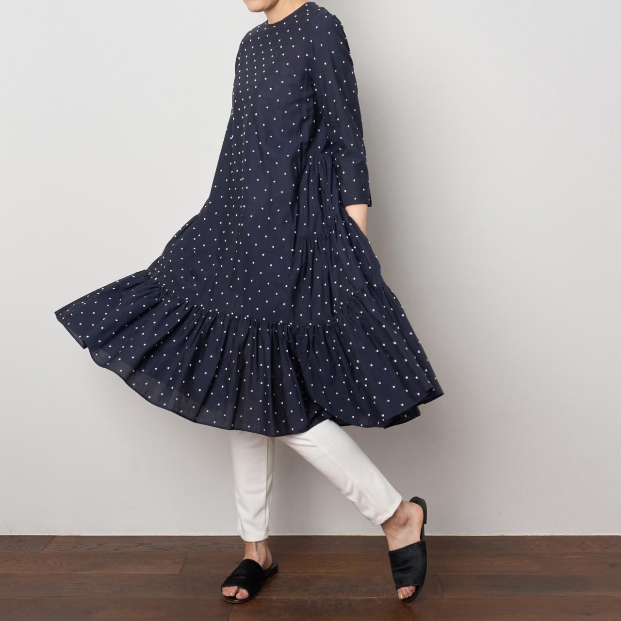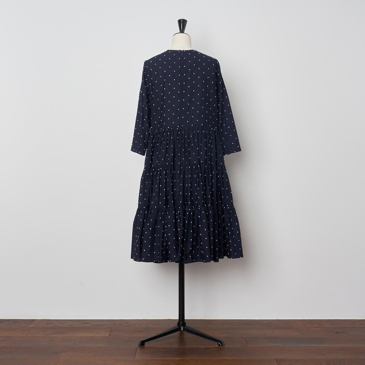小さなドット模様が凹凸に織り込まれた、綿麻素材の生地のワンピースです。