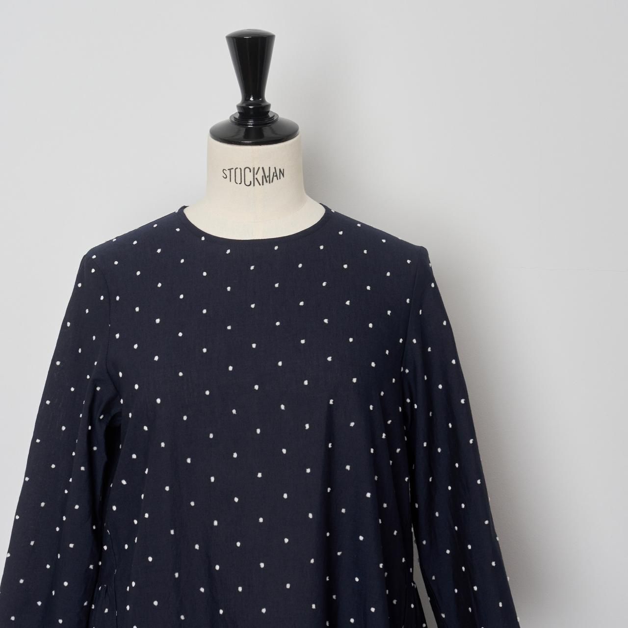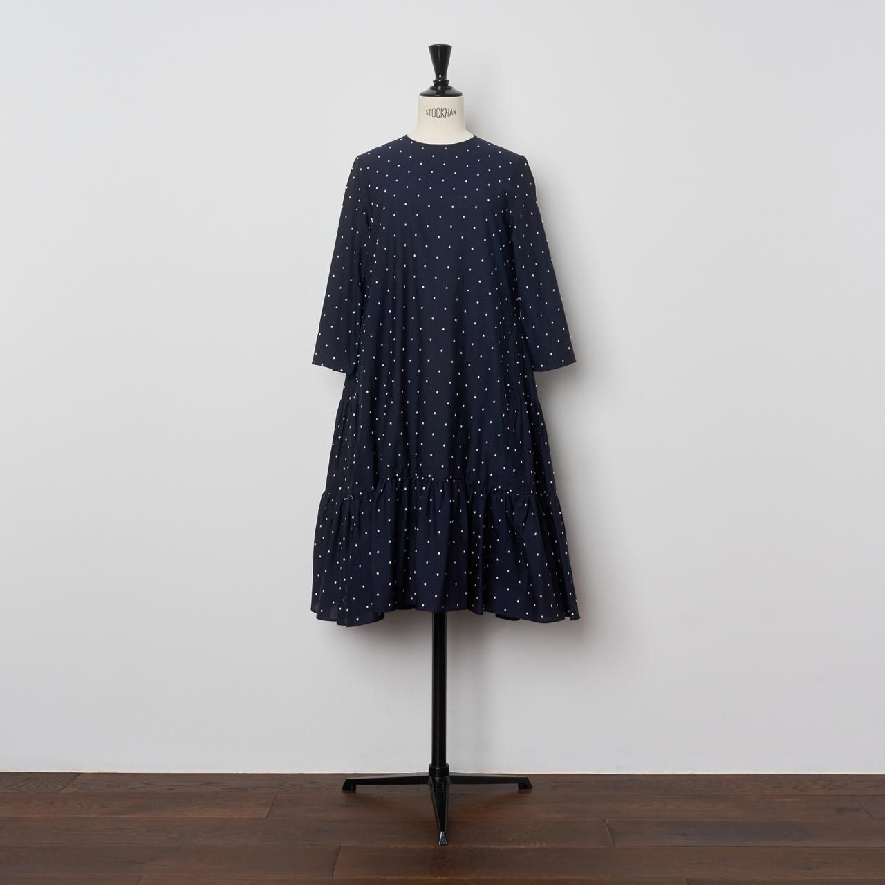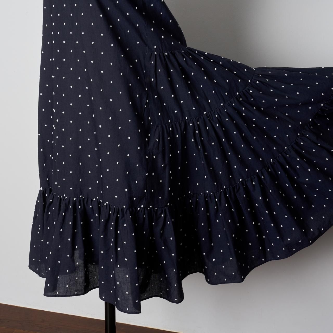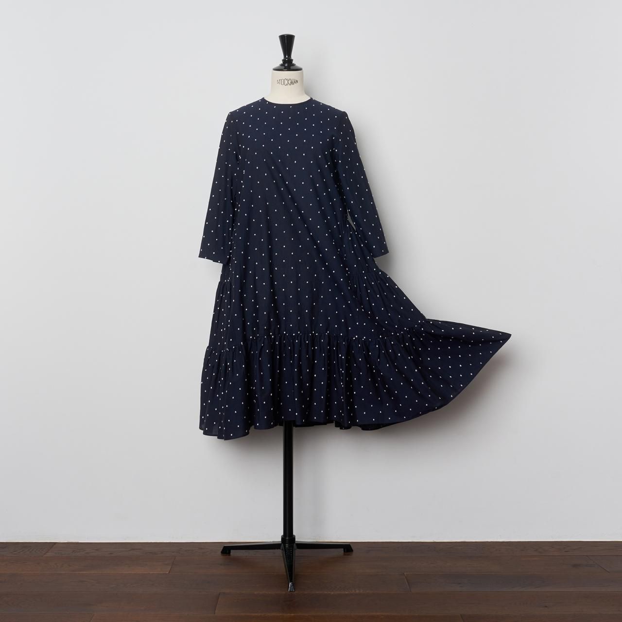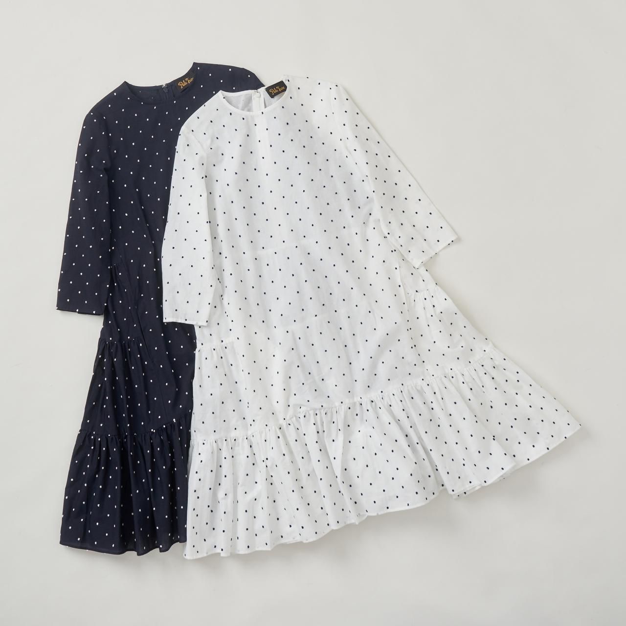 小さなドット模様が凹凸に織り込まれた、綿麻素材の生地のワンピースです。