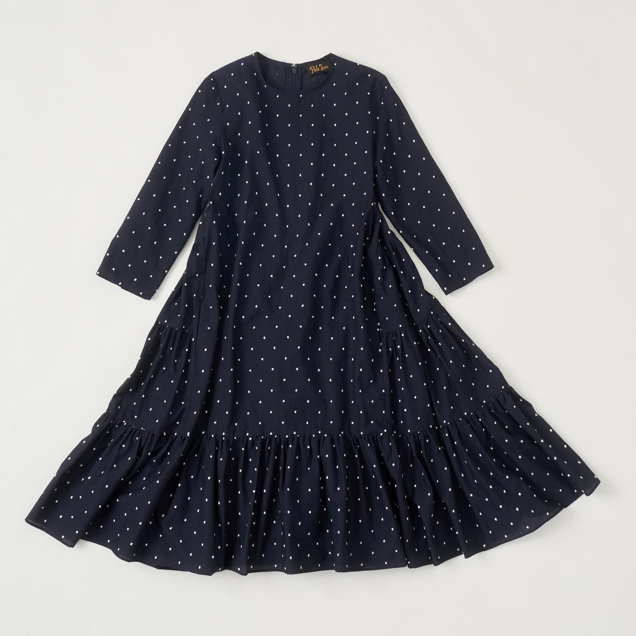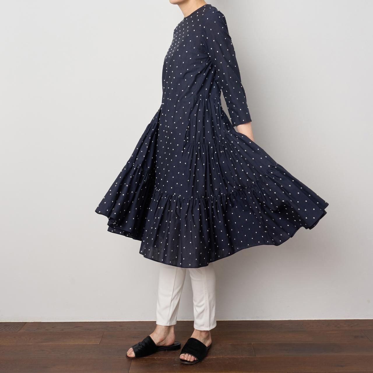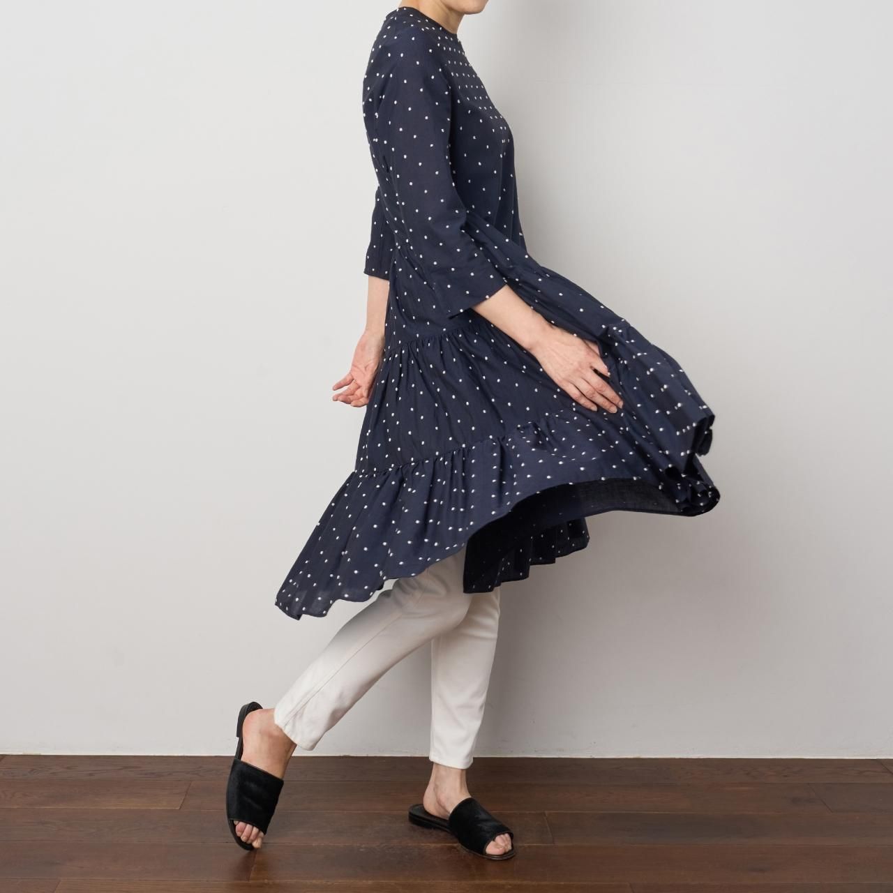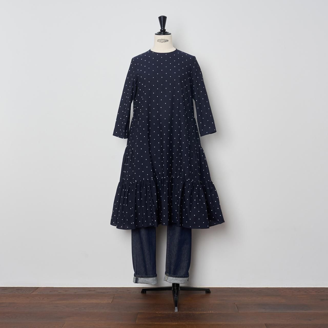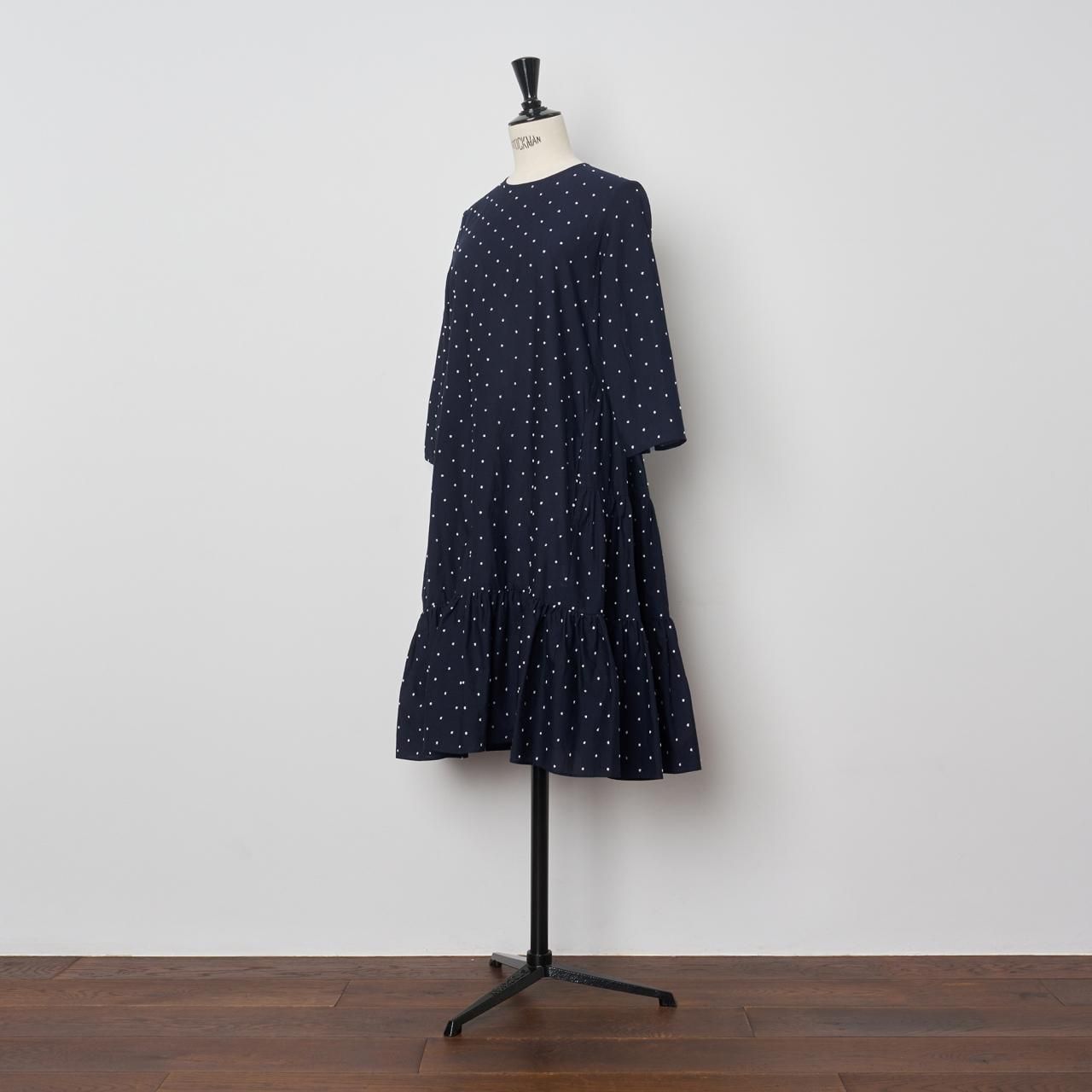 小さなドット模様が凹凸に織り込まれた、綿麻素材の生地のワンピースです。