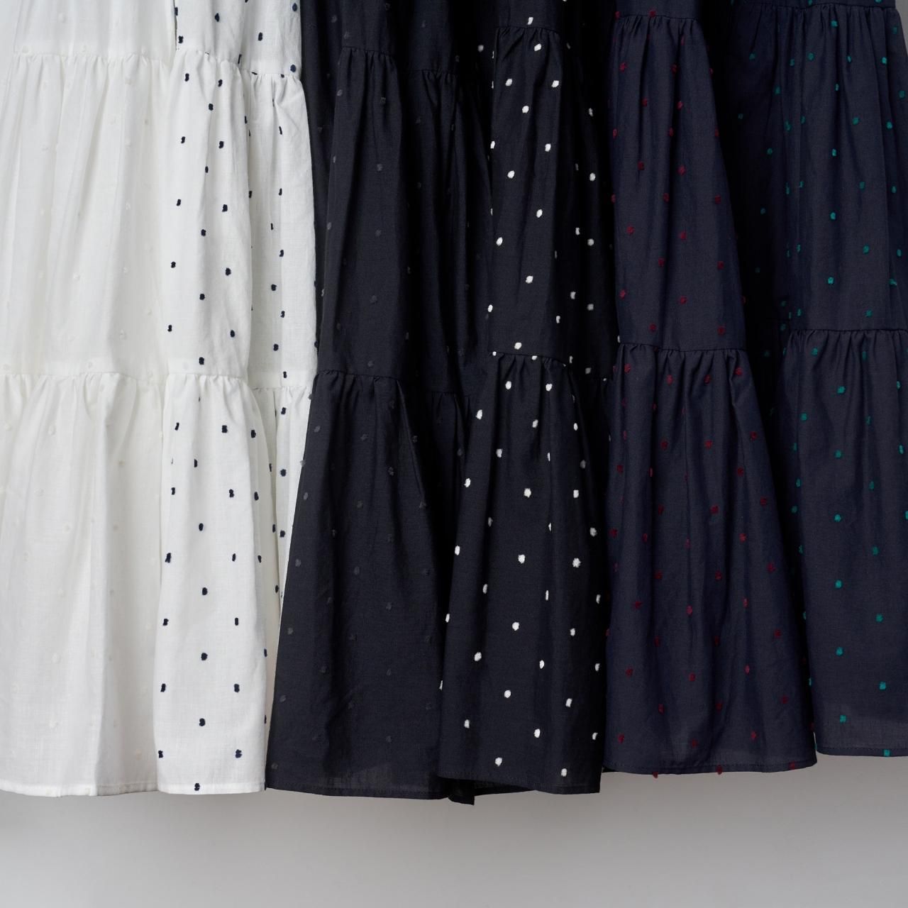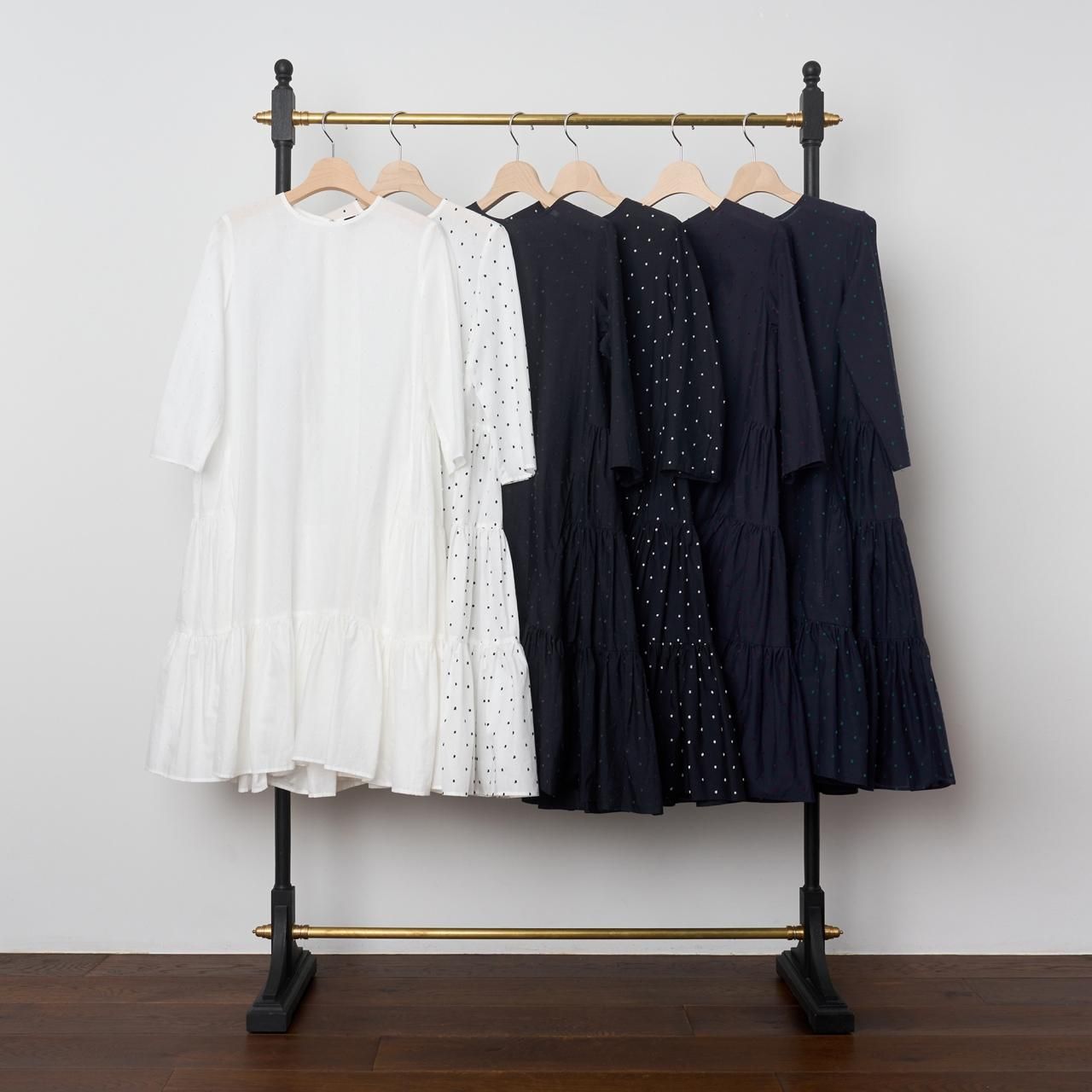 フロントはAラインのすっきりとした印象で、後ろはたっぷりとギャザーを寄せた三段のティアードのデザイン。