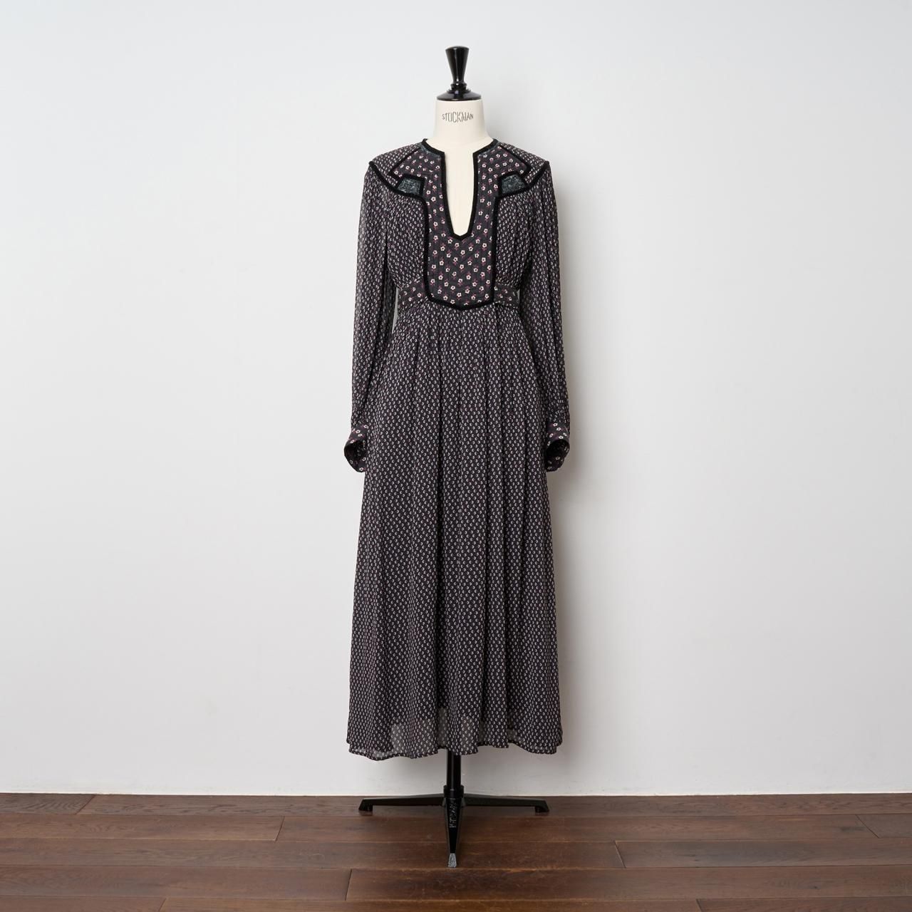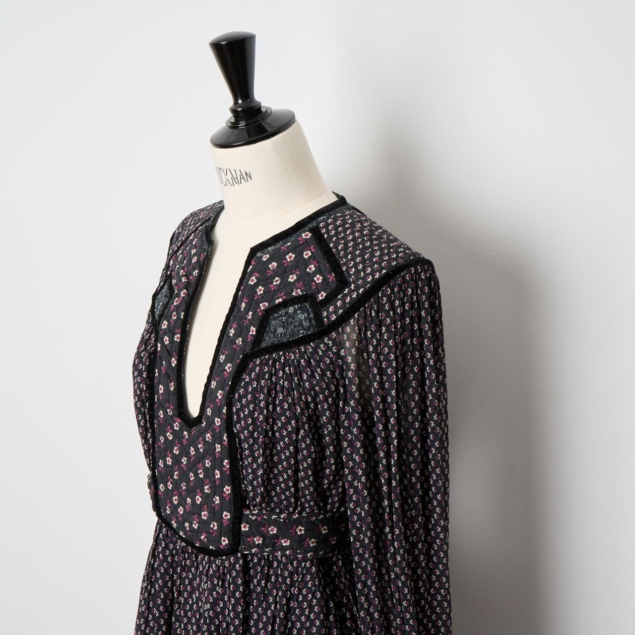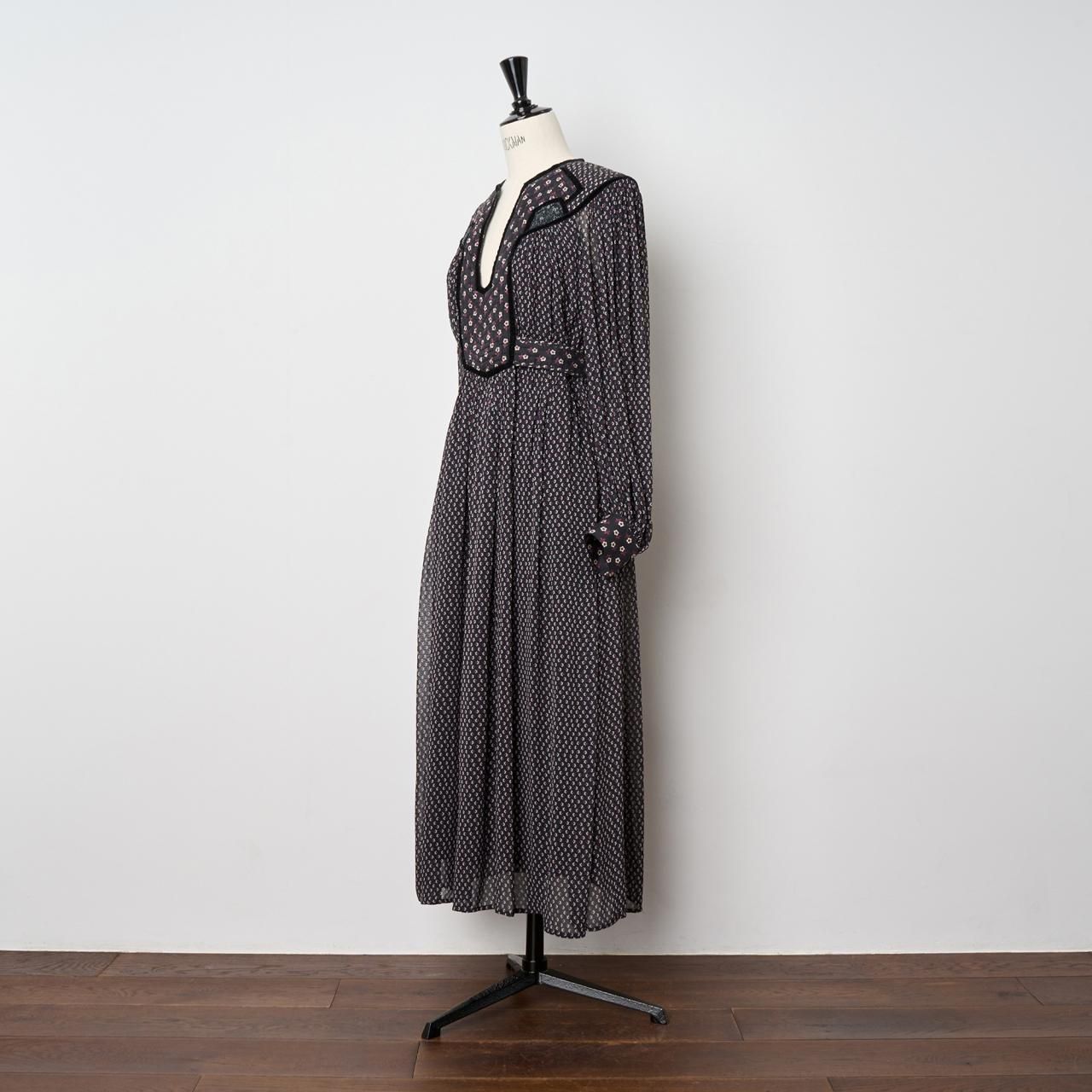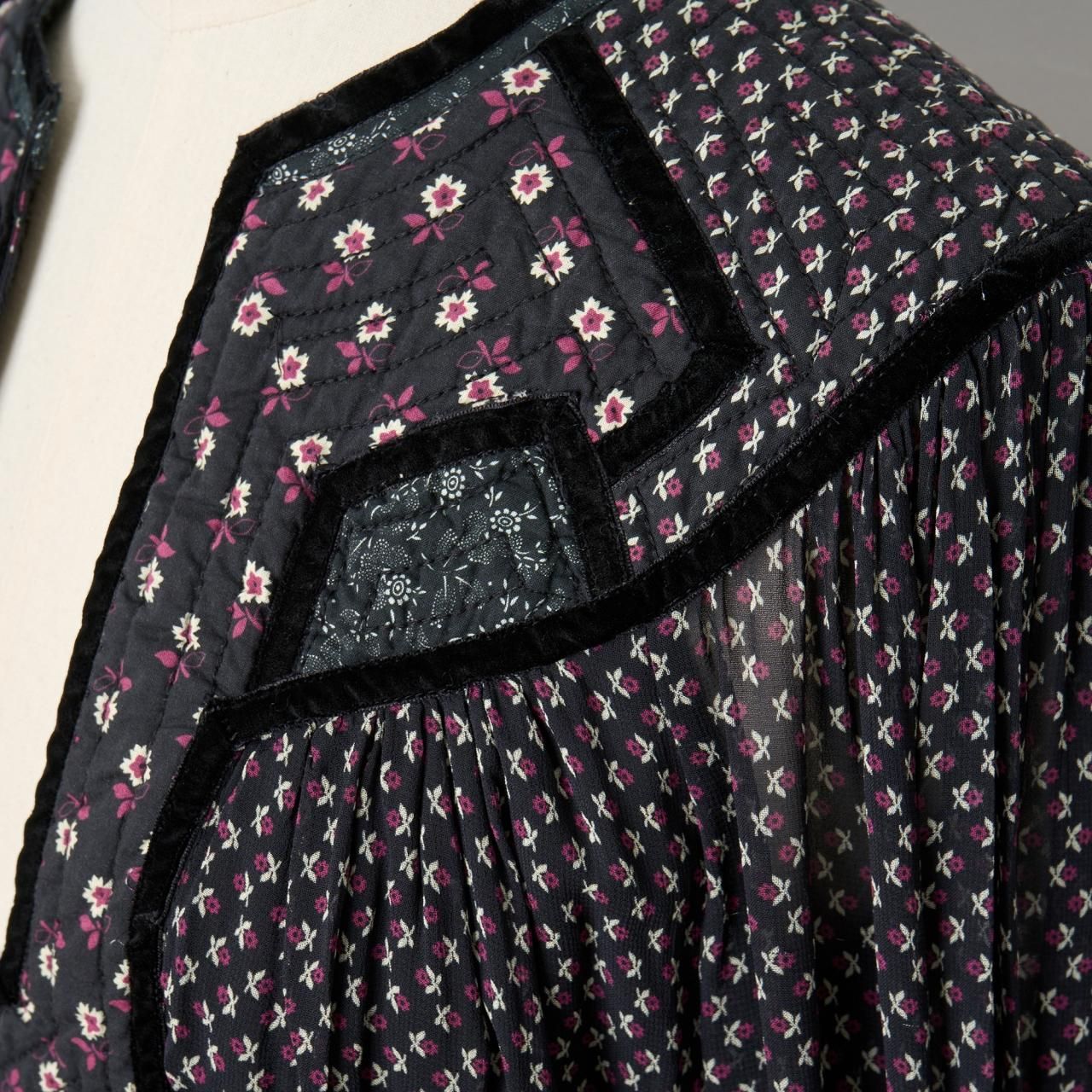 胸元から背中にかけてデザインされたパッチワークパネルにベルベットのパイピングが施されているのも素敵なポイント。