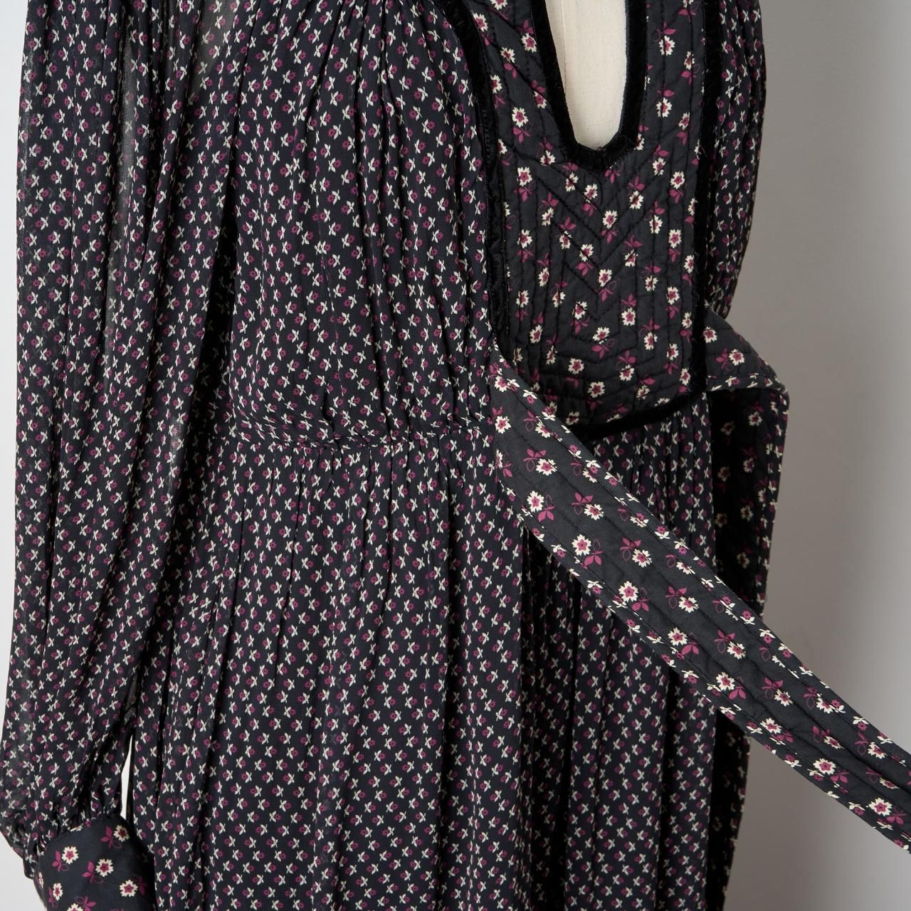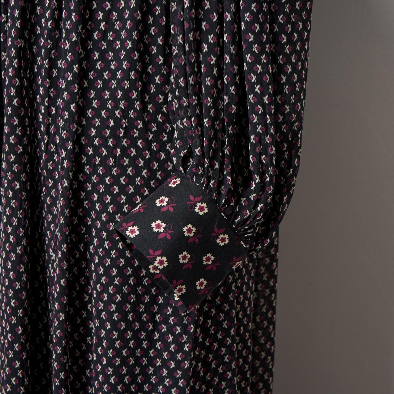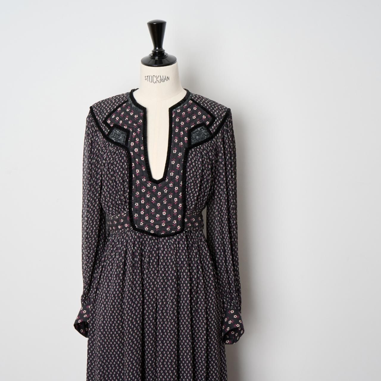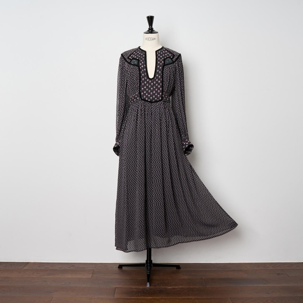 胸元から背中にかけてデザインされたパッチワークパネルにベルベットのパイピングが施されているのも素敵なポイント。