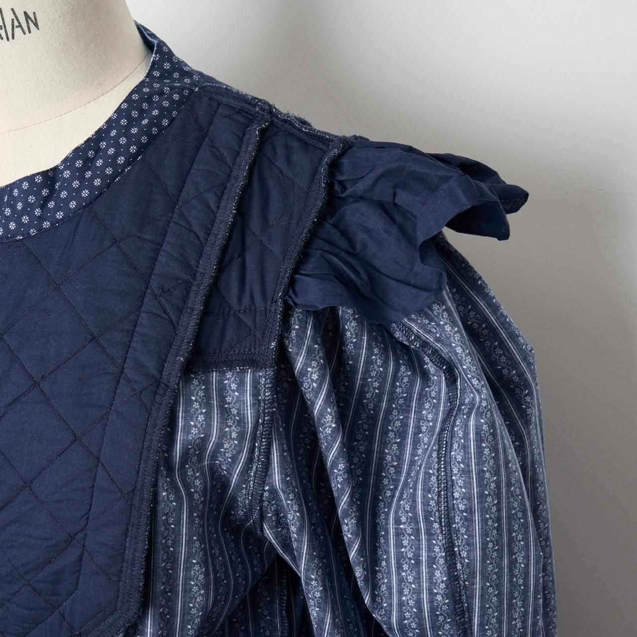 ショルダー部分には肩のデザインをより美しく作るため内側に張りのある素材が縫い付けられていて、ボリュームのある肩デザインのスリーブは袖口に向かい細くなるスッキリしたシルエットです。