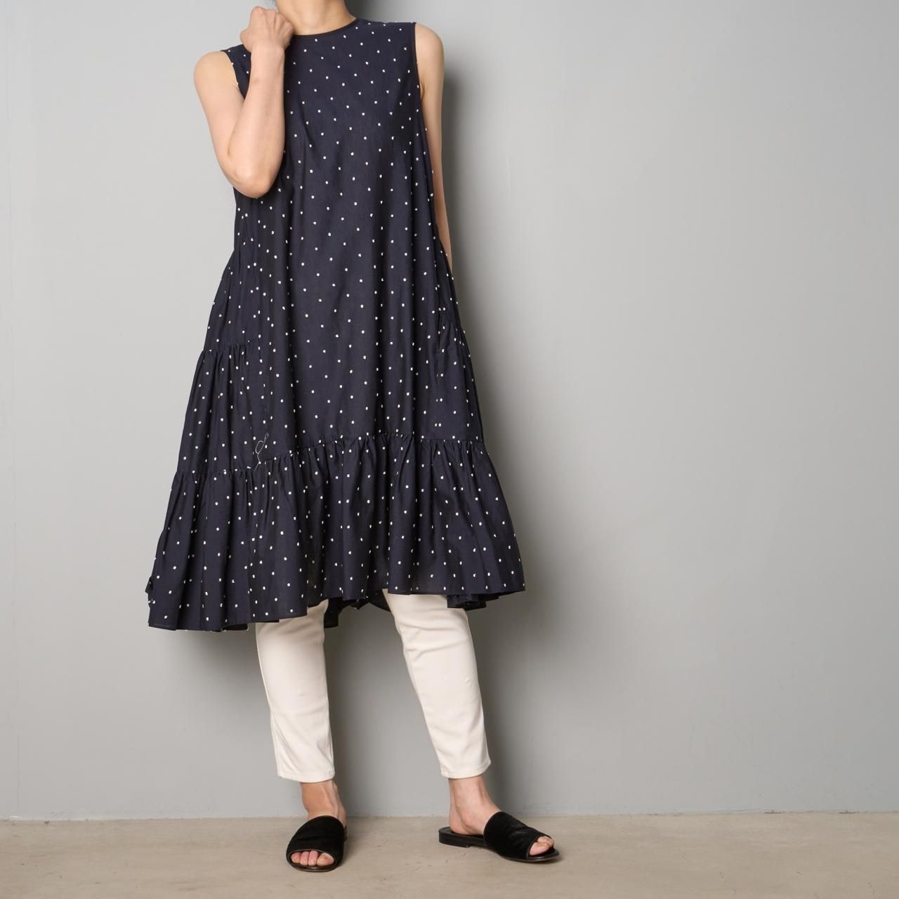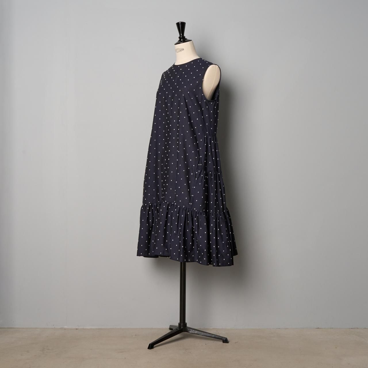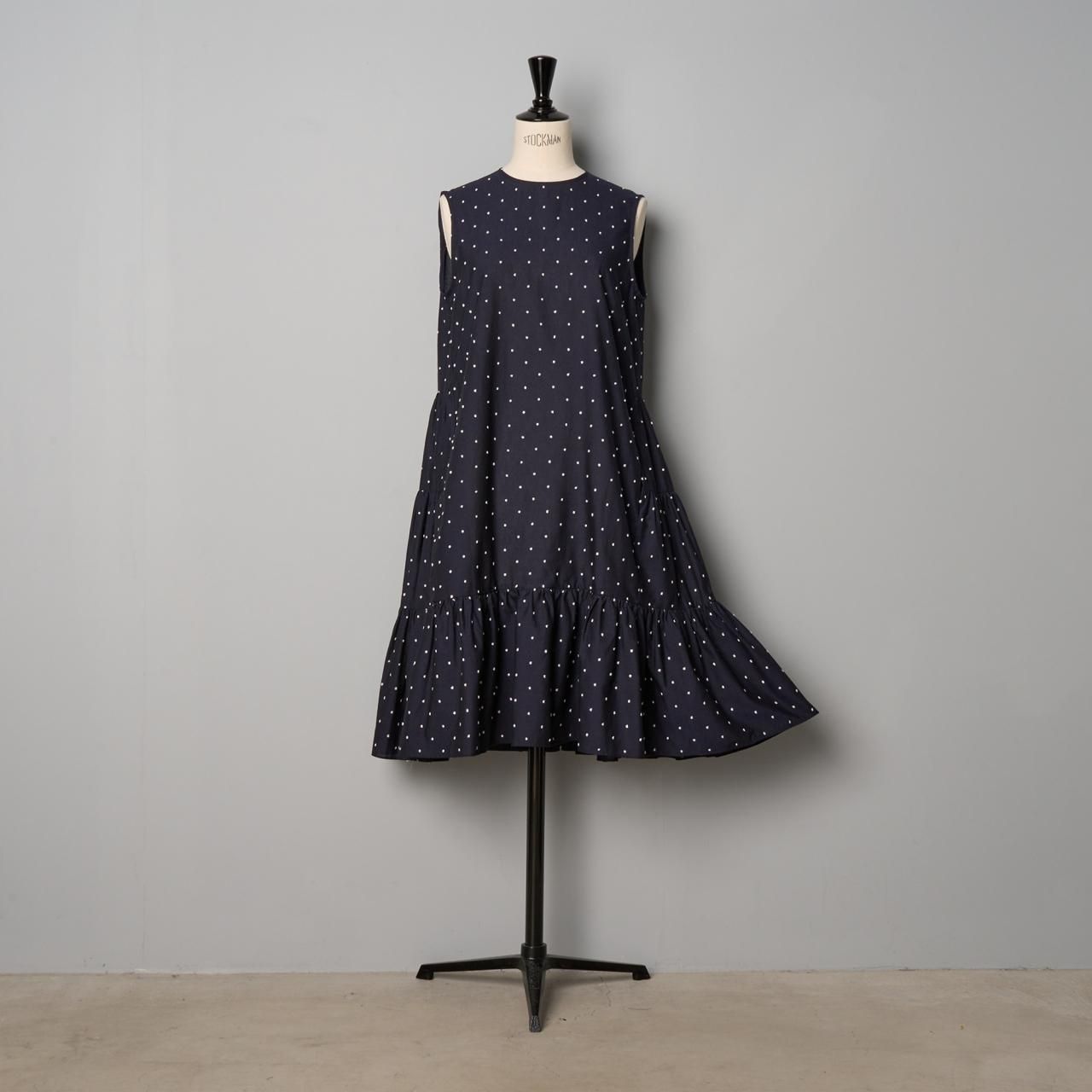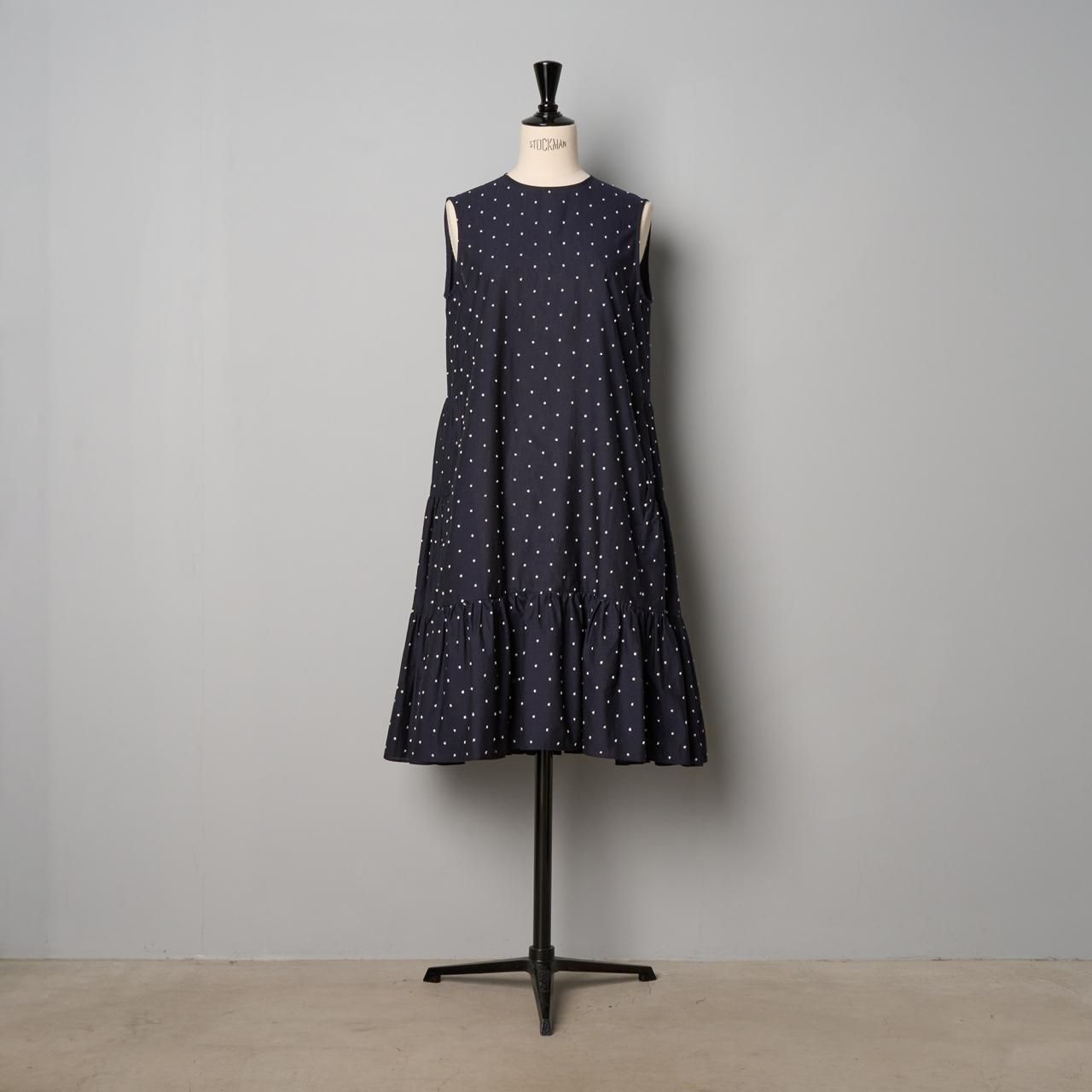 小さなドット模様が凹凸に織り込まれた、綿麻素材の生地のワンピースです。