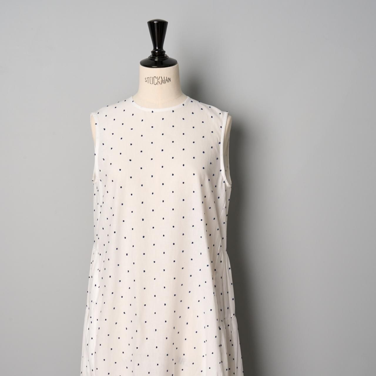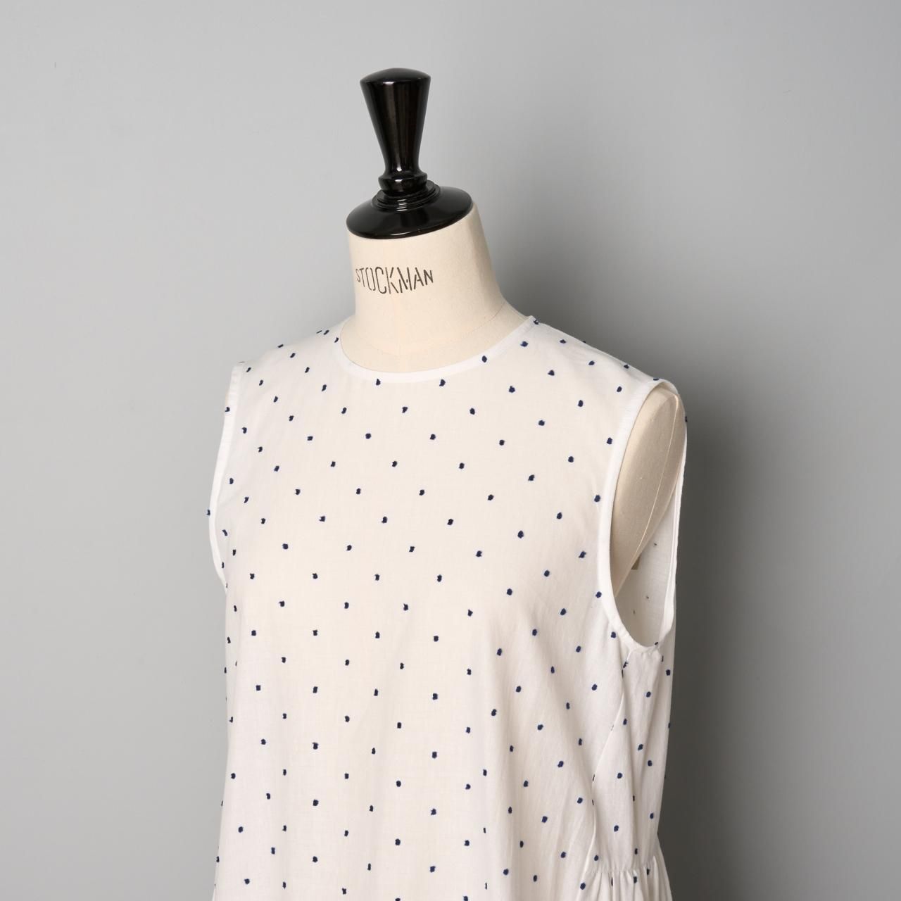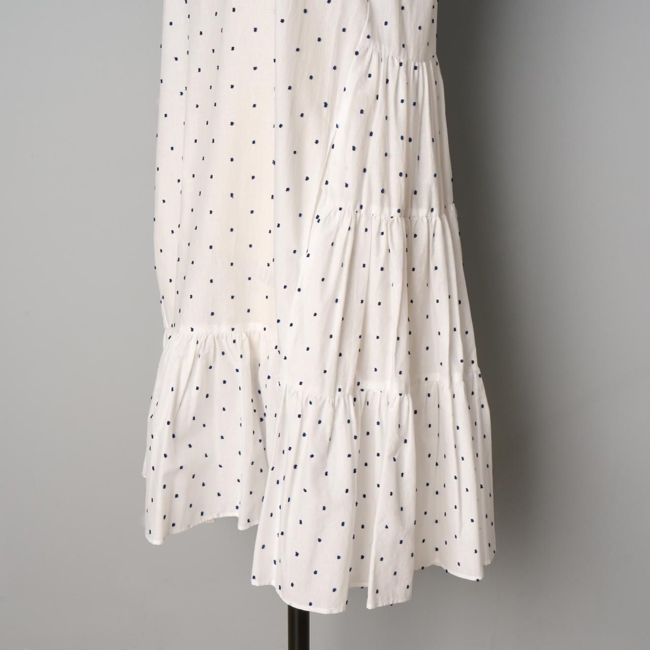小さなドット模様が凹凸に織り込まれた、綿麻素材の生地のワンピースです。