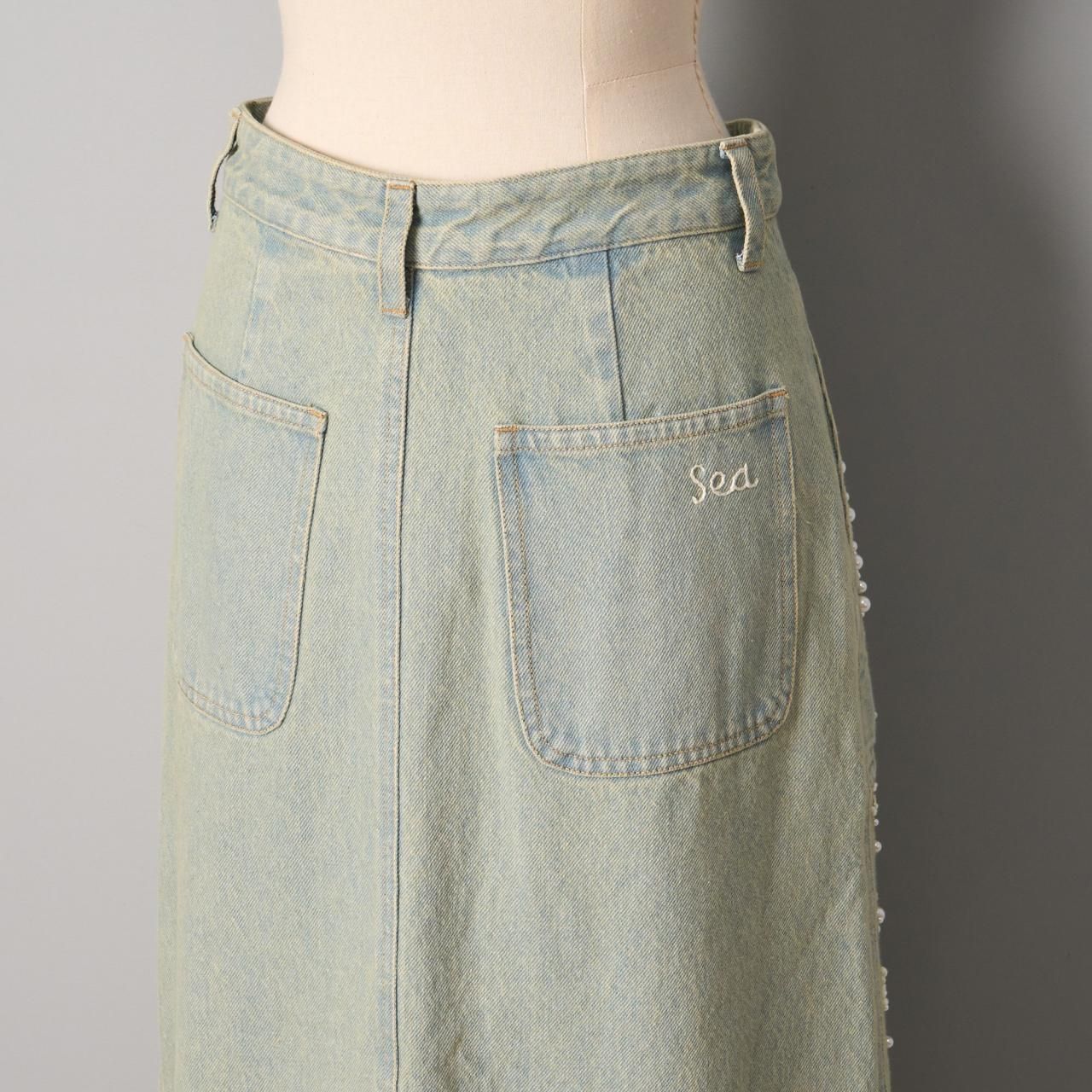 ハイウエストに大きめのポケット、ヴィンテージ感のあるカラーでカジュアルですがパールがある事で女性らしく上品に仕上げられています。