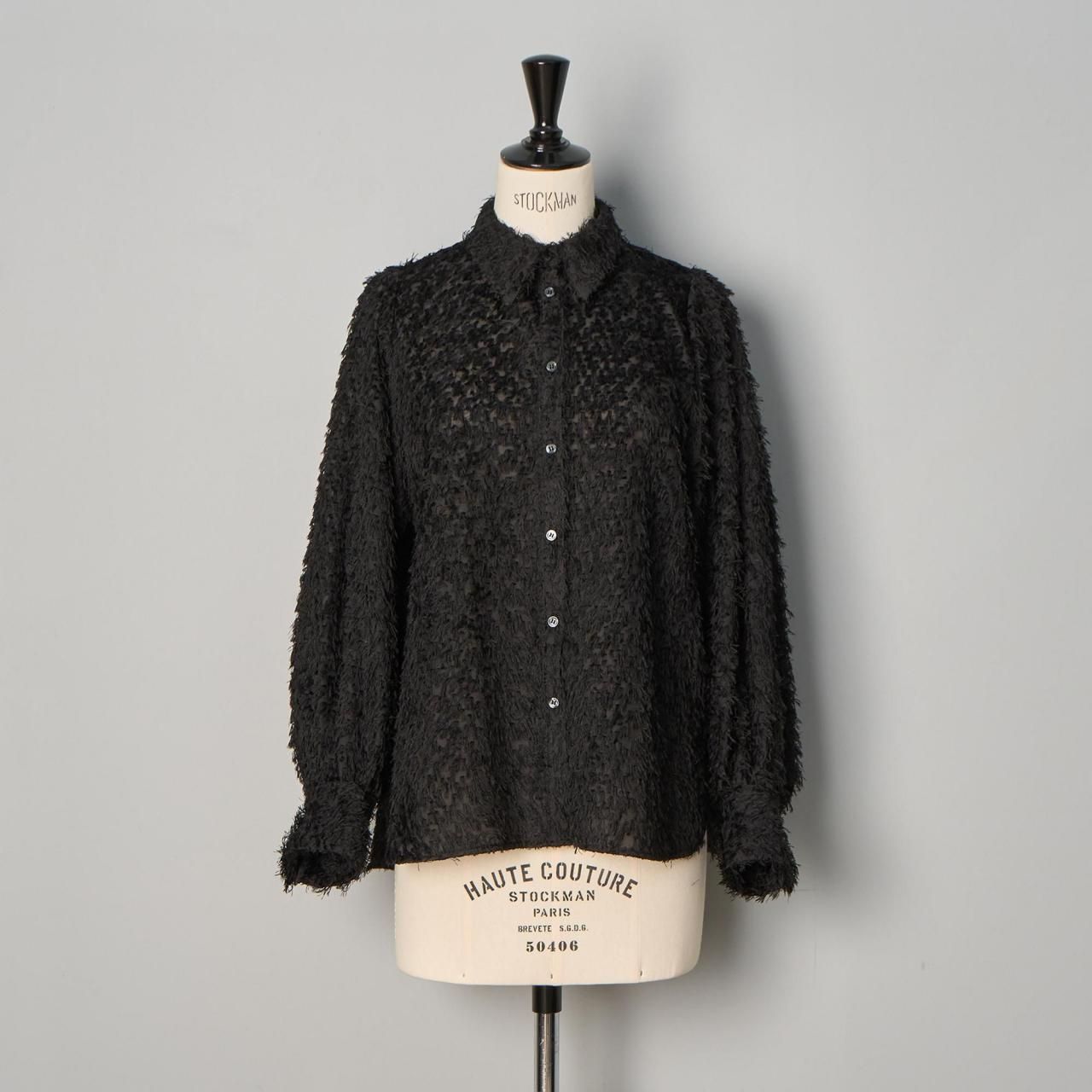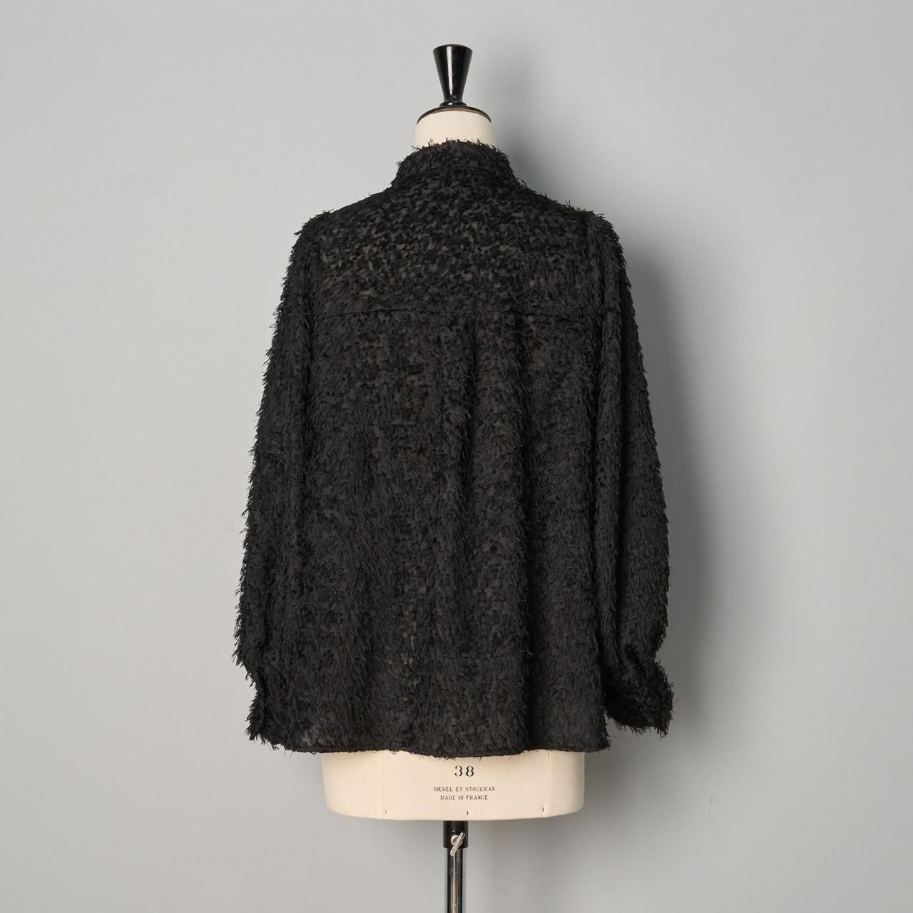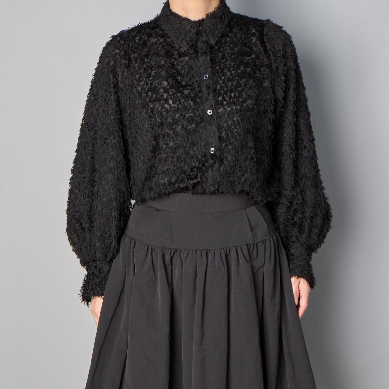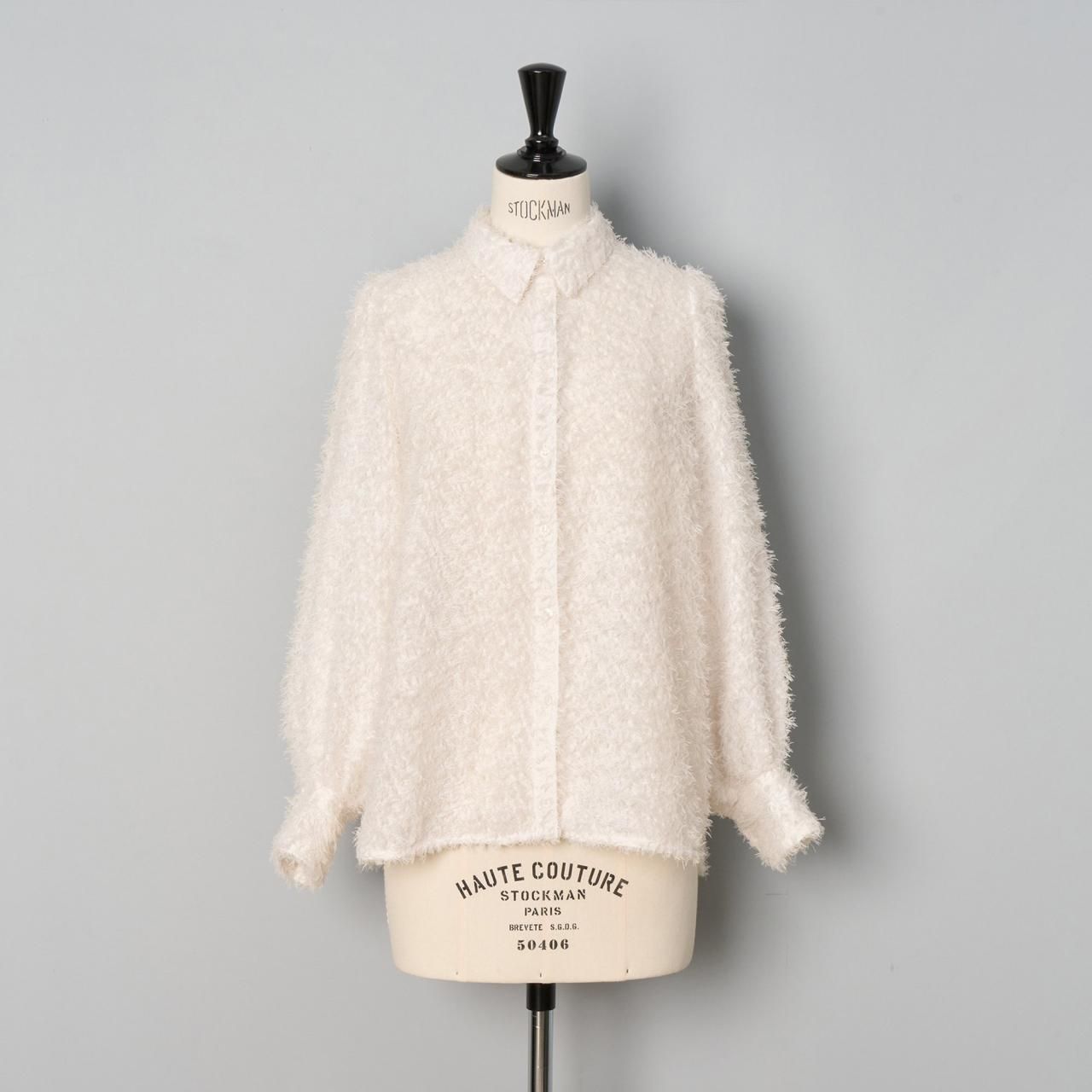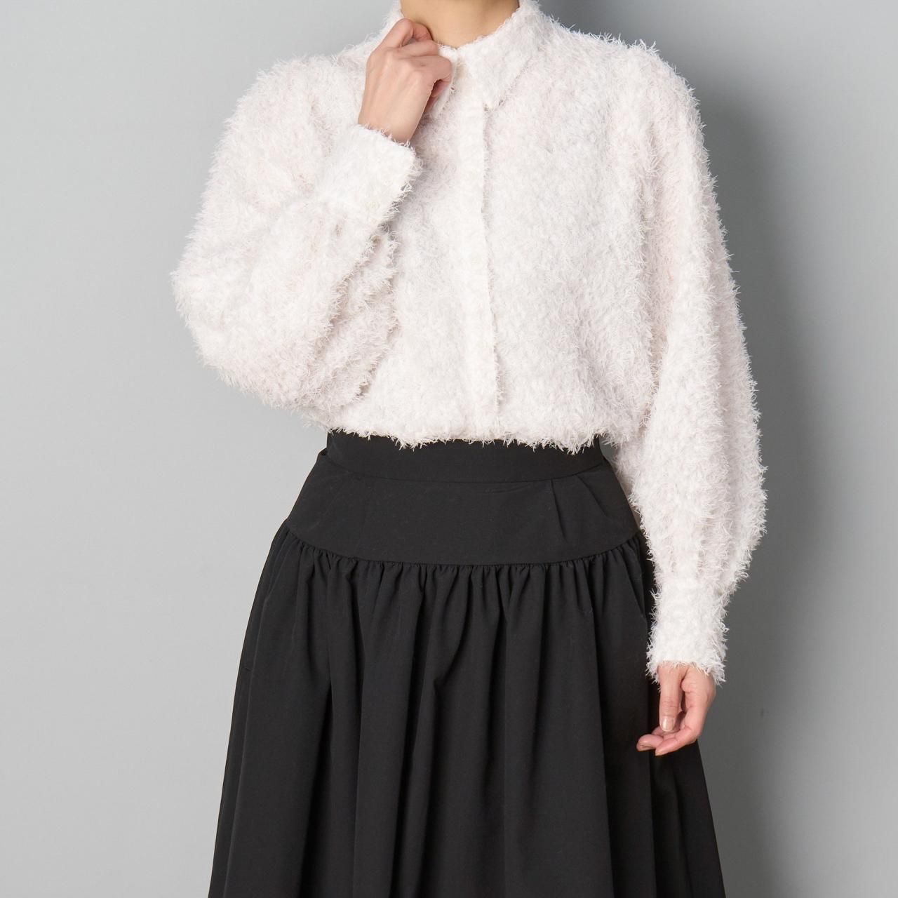少し小さめの襟と、肩からゆるく広がるボリュームのある袖が印象的です。