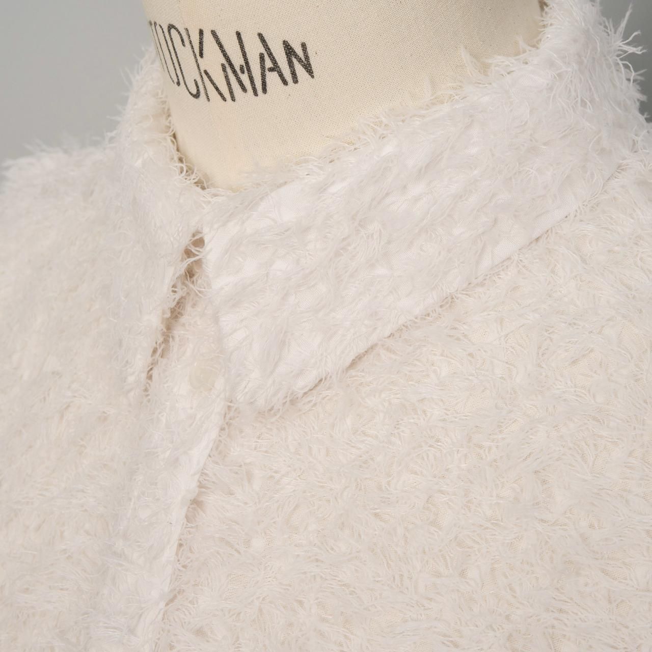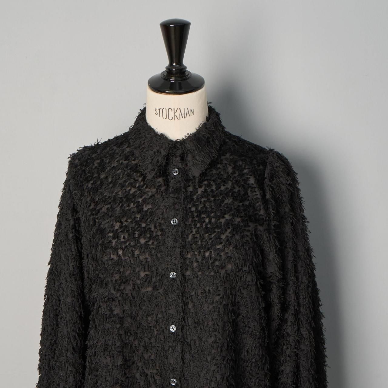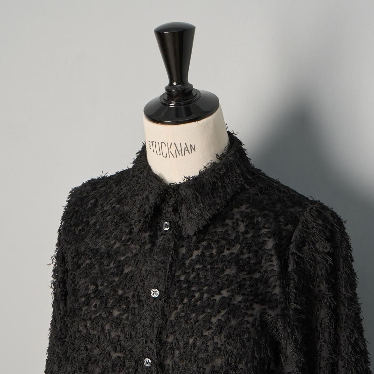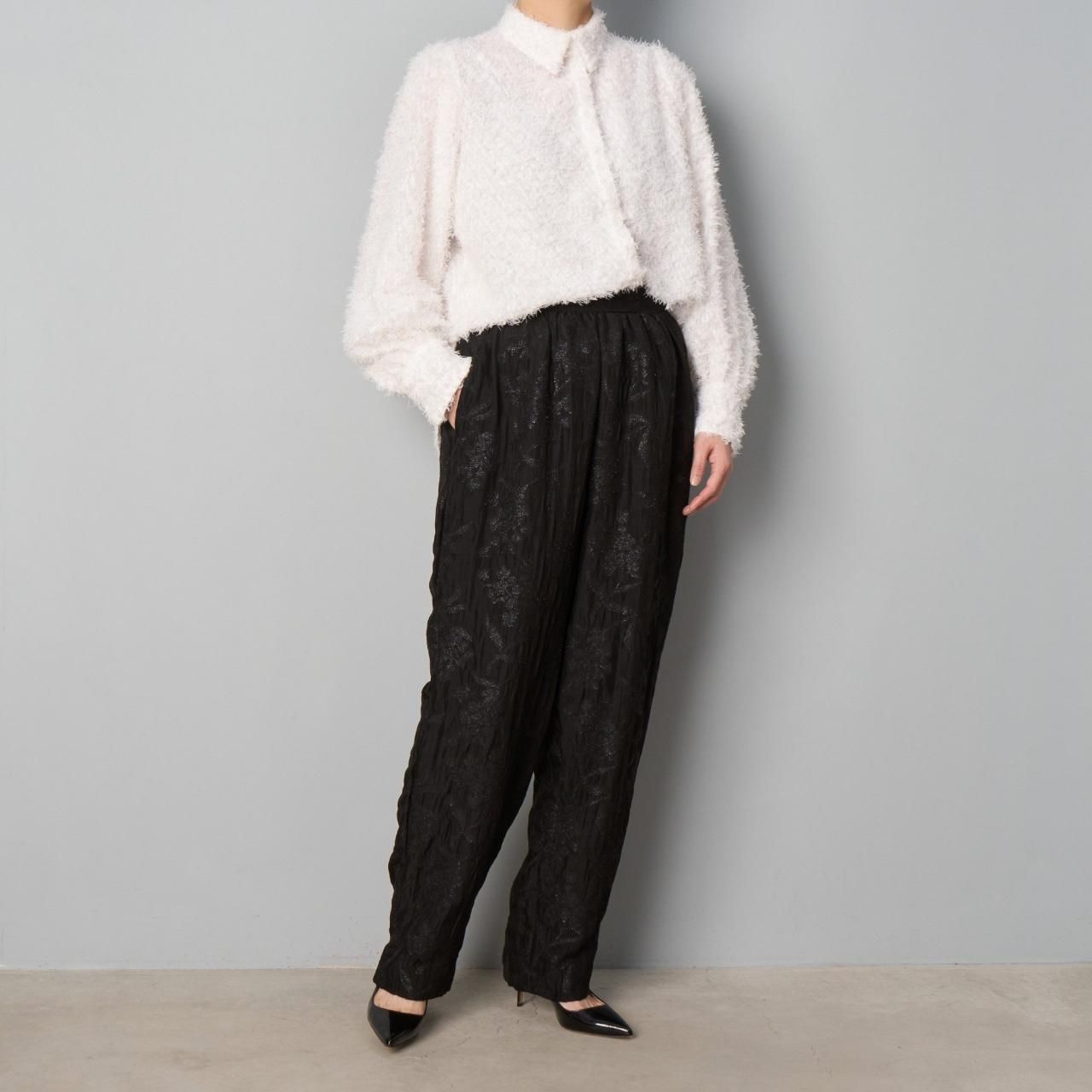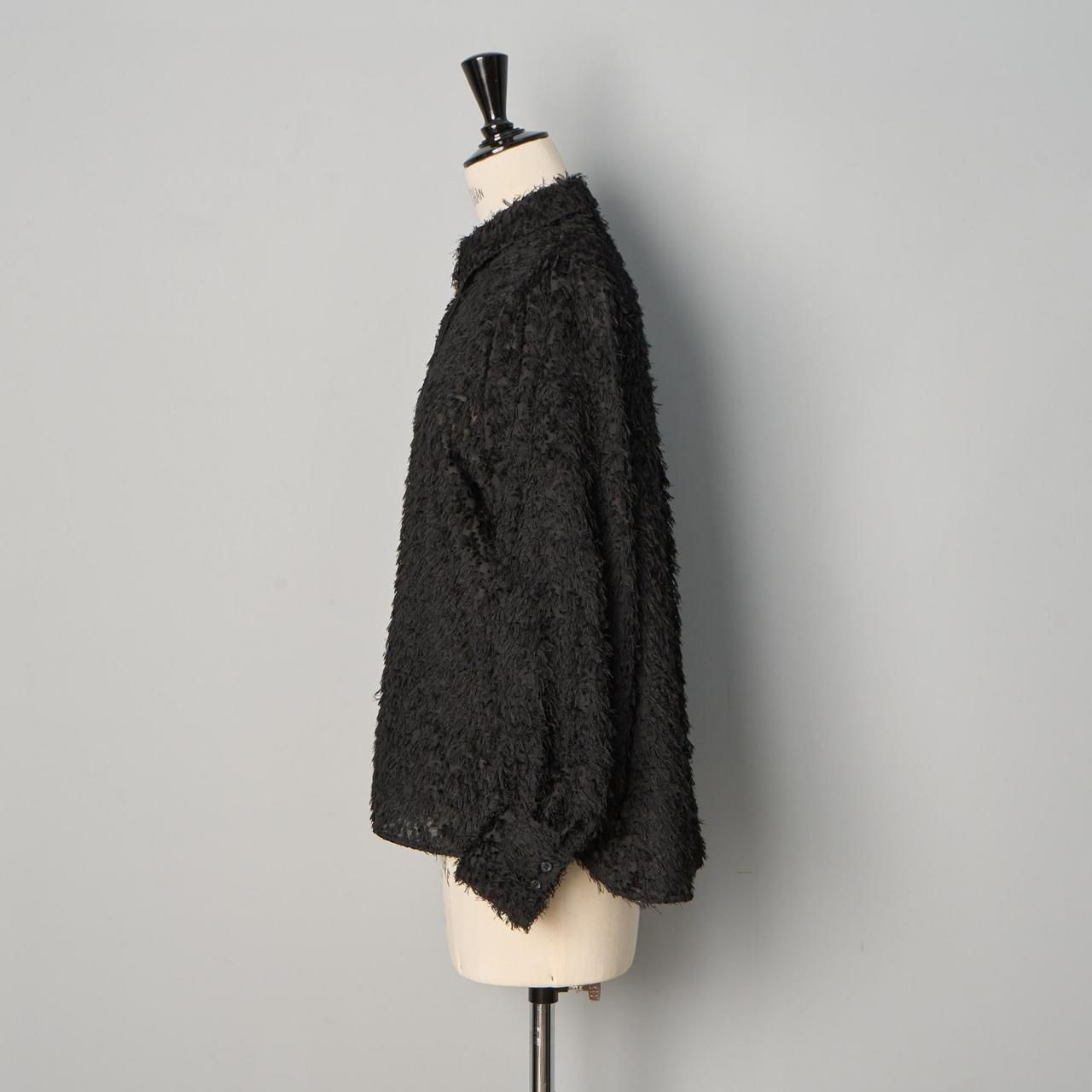 少し小さめの襟と、肩からゆるく広がるボリュームのある袖が印象的です。