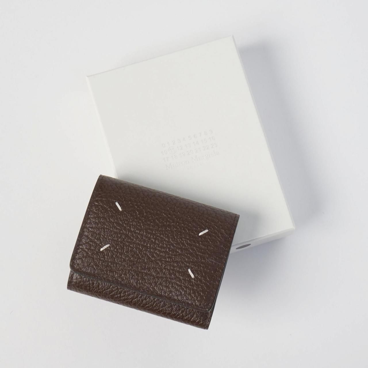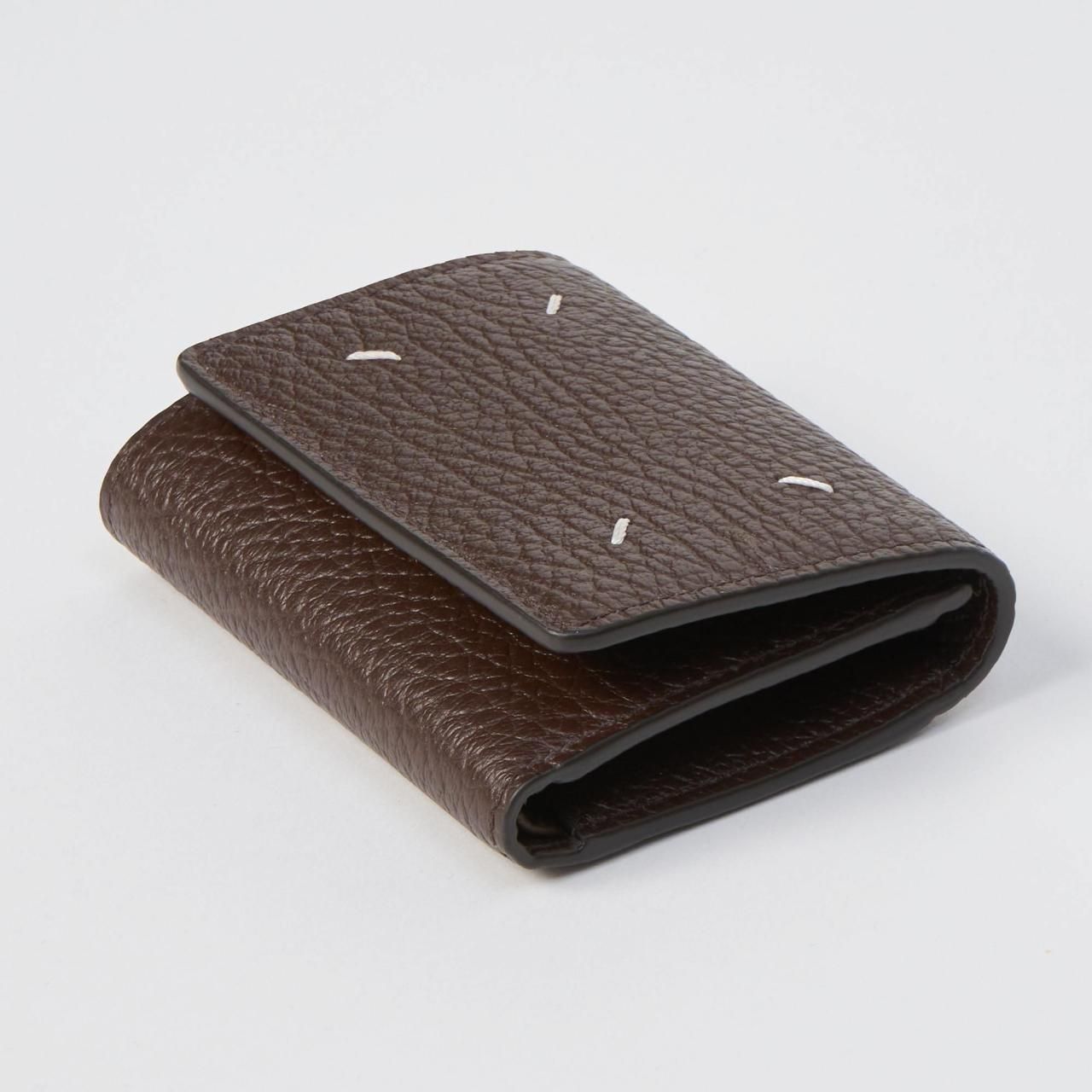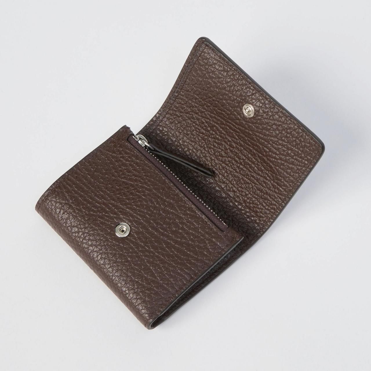 エンボス加工が施されたグレイニーレザー製のスリーフォールドウォレット。