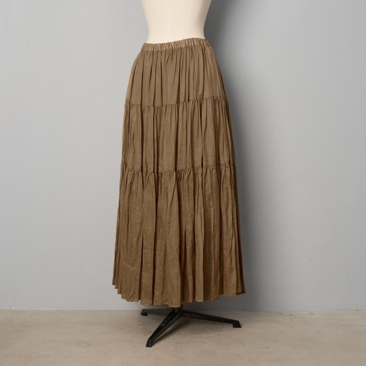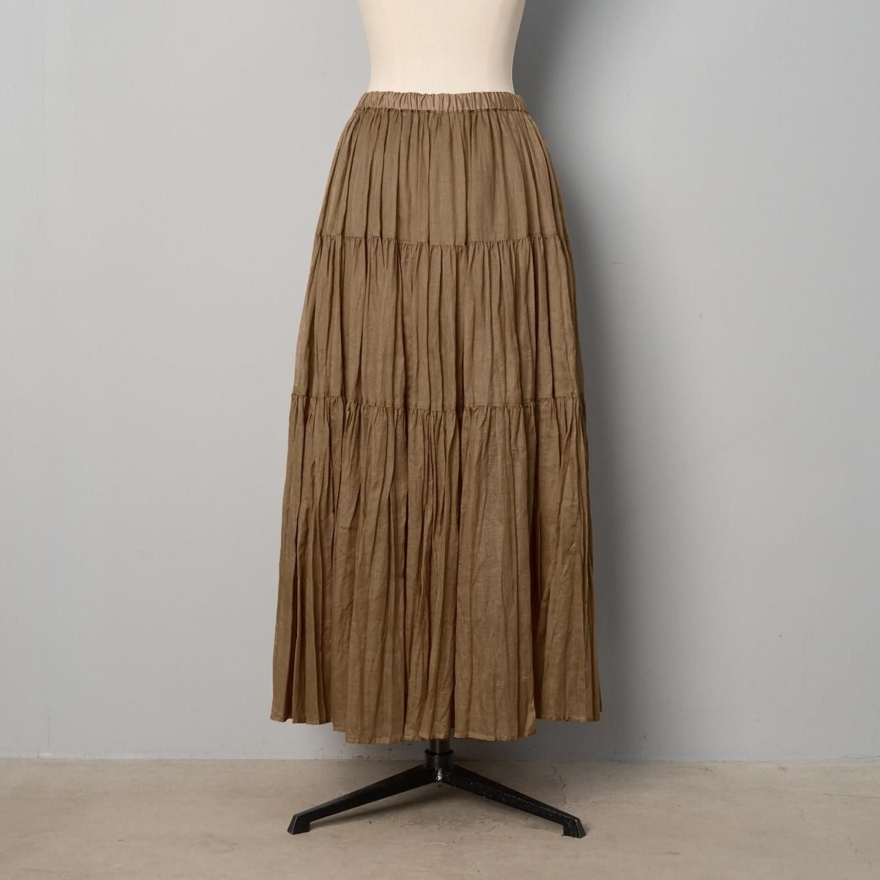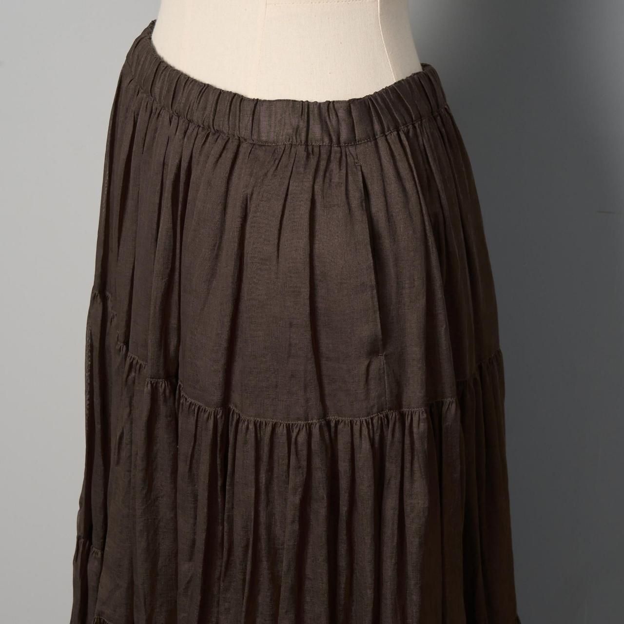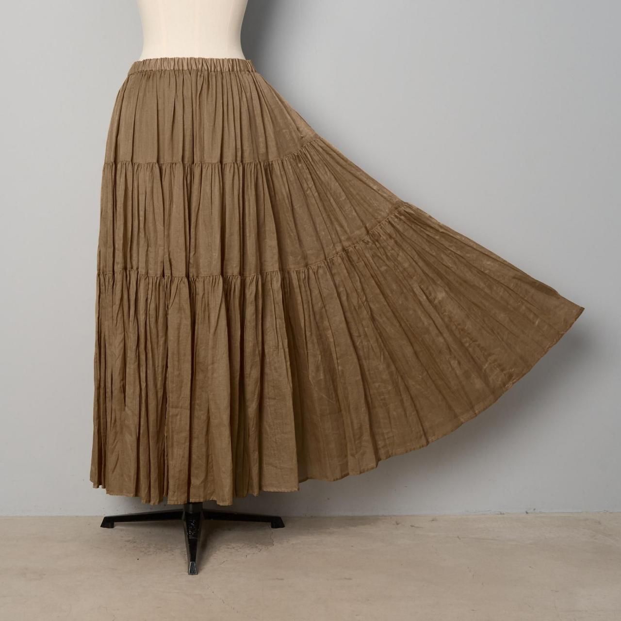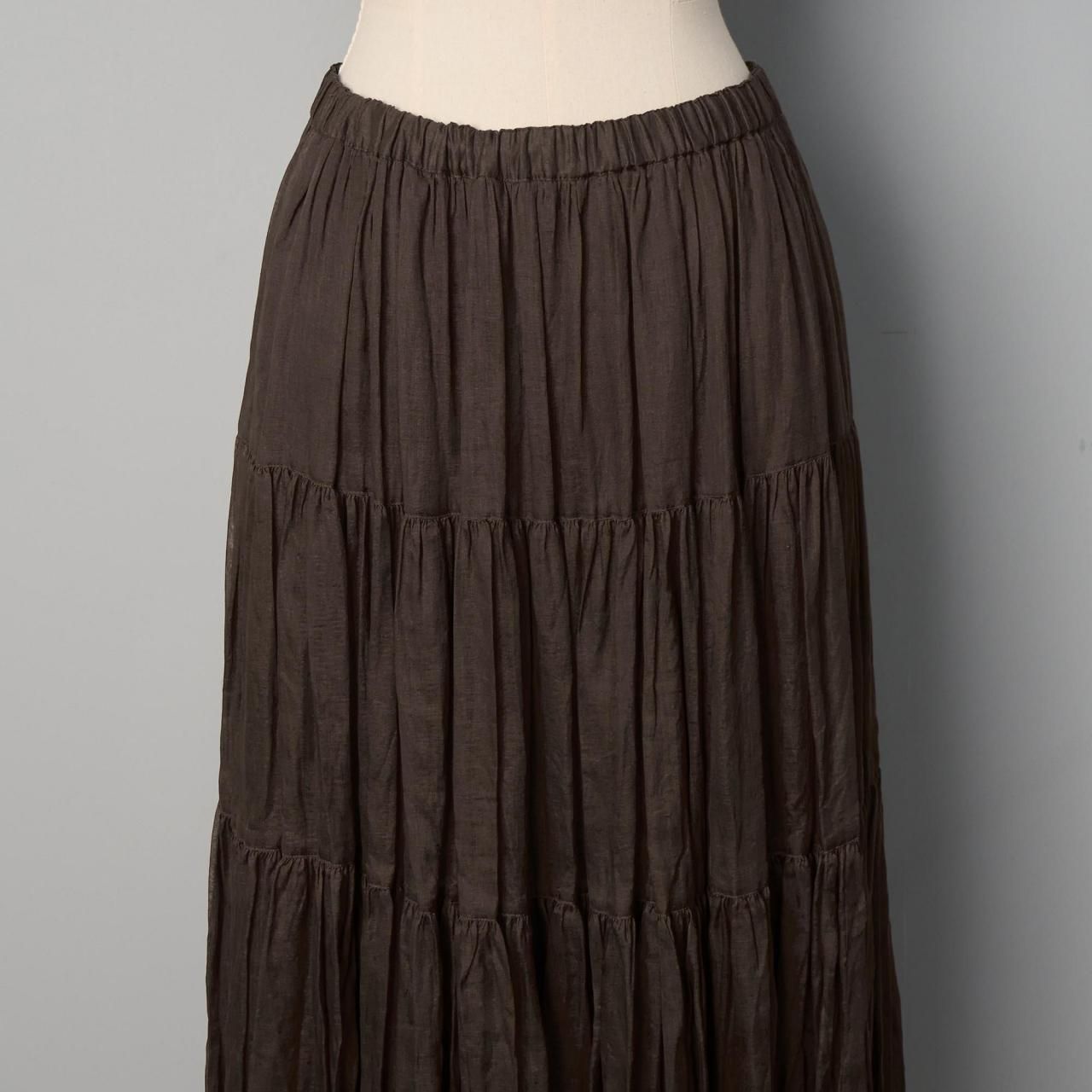 ゴムウエストにたっぷりとギャザーを寄せてあるこのスカートは、切り替えごとにギャザーの分量を変え動いた時に美しくみえるシルエットに仕上げています。