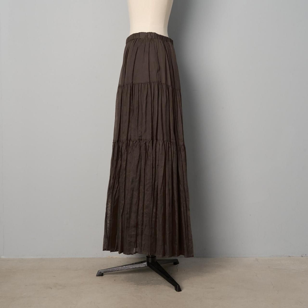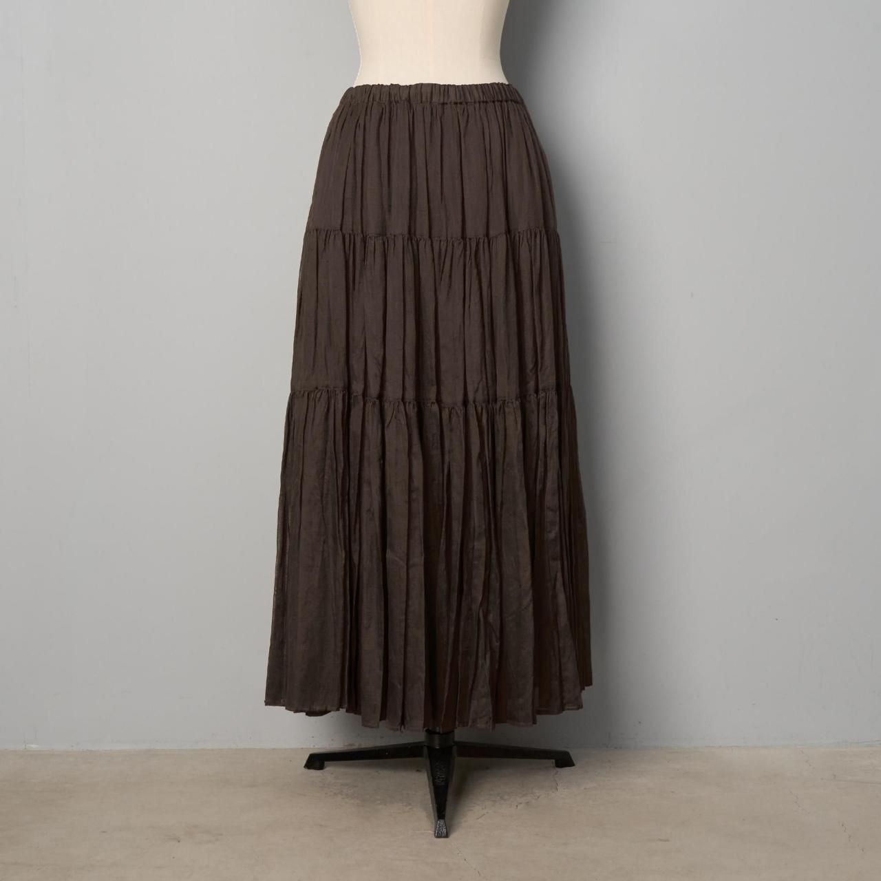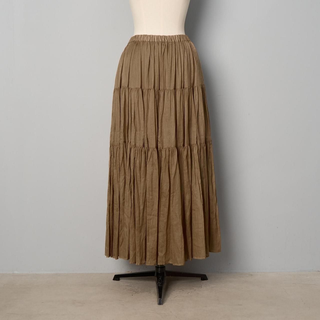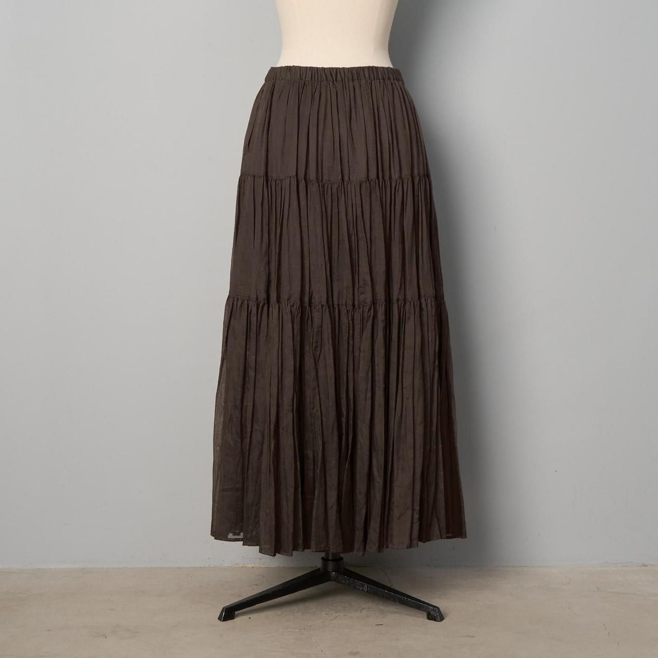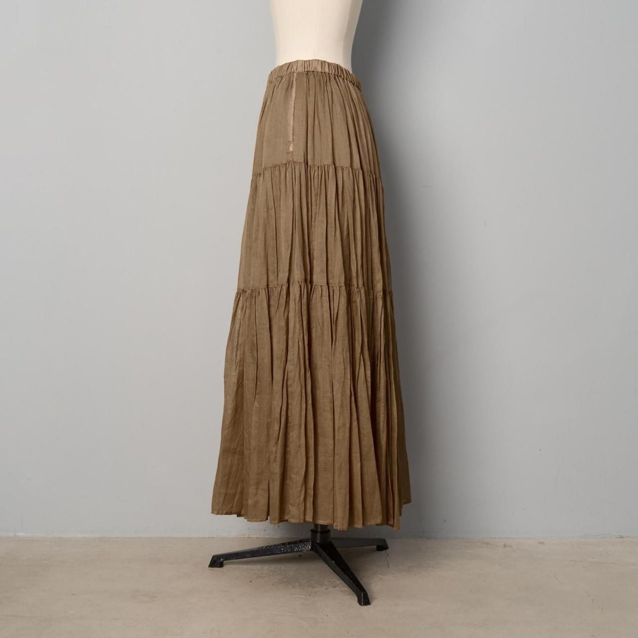 ゴムウエストにたっぷりとギャザーを寄せてあるこのスカートは、切り替えごとにギャザーの分量を変え動いた時に美しくみえるシルエットに仕上げています。